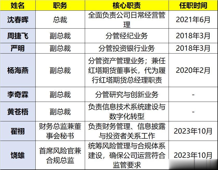 截至2025年12月29日,红塔证券高管团队成员为总裁沈春晖,全面负责公司日常经营管理;副总裁团队包括周捷飞(2018年3月任职,分管经纪业务)、严明(2018年3月任职,分管投资银行业务)、杨海燕(2020年2月任职,分管资产管理业务,2025年3月起兼任红塔期货董事长及总经理)、李奇霖(分管研究与创新业务)、黄苍梧(副总裁,负责信息技术系统建设与数字化转型)。