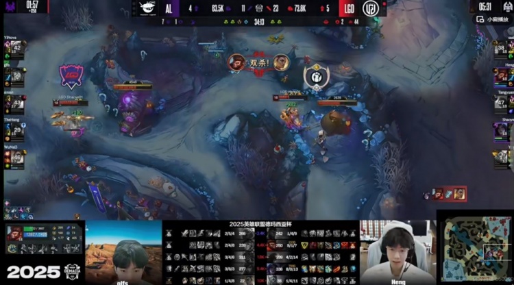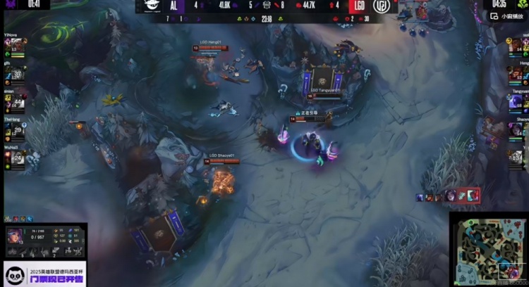 [25:25]LGD拿下大龙!残局YiNova安蓓萨大招留住了sasi奎桑提,AL三人还想强追Shaoye卡莎但是他有净化啊!残局Heng猴子绕后切死没血的glfs莉莉娅,Shaoye卡莎开飞贴脸强杀TheHang厄斐琉斯,AL各个击破打出2换4,随后Shaoye卡莎上路勾引,配合队友还逮捕了sinian永恩!这波打完LGD经济优势来到7K!