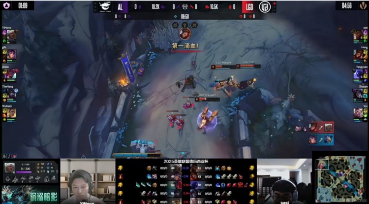 [6:50]AL拿下第一条小龙,LGD四人越上花了超过半分钟才越塔强杀掉了Yinova安蓓萨,一血给到了Heng猴子!