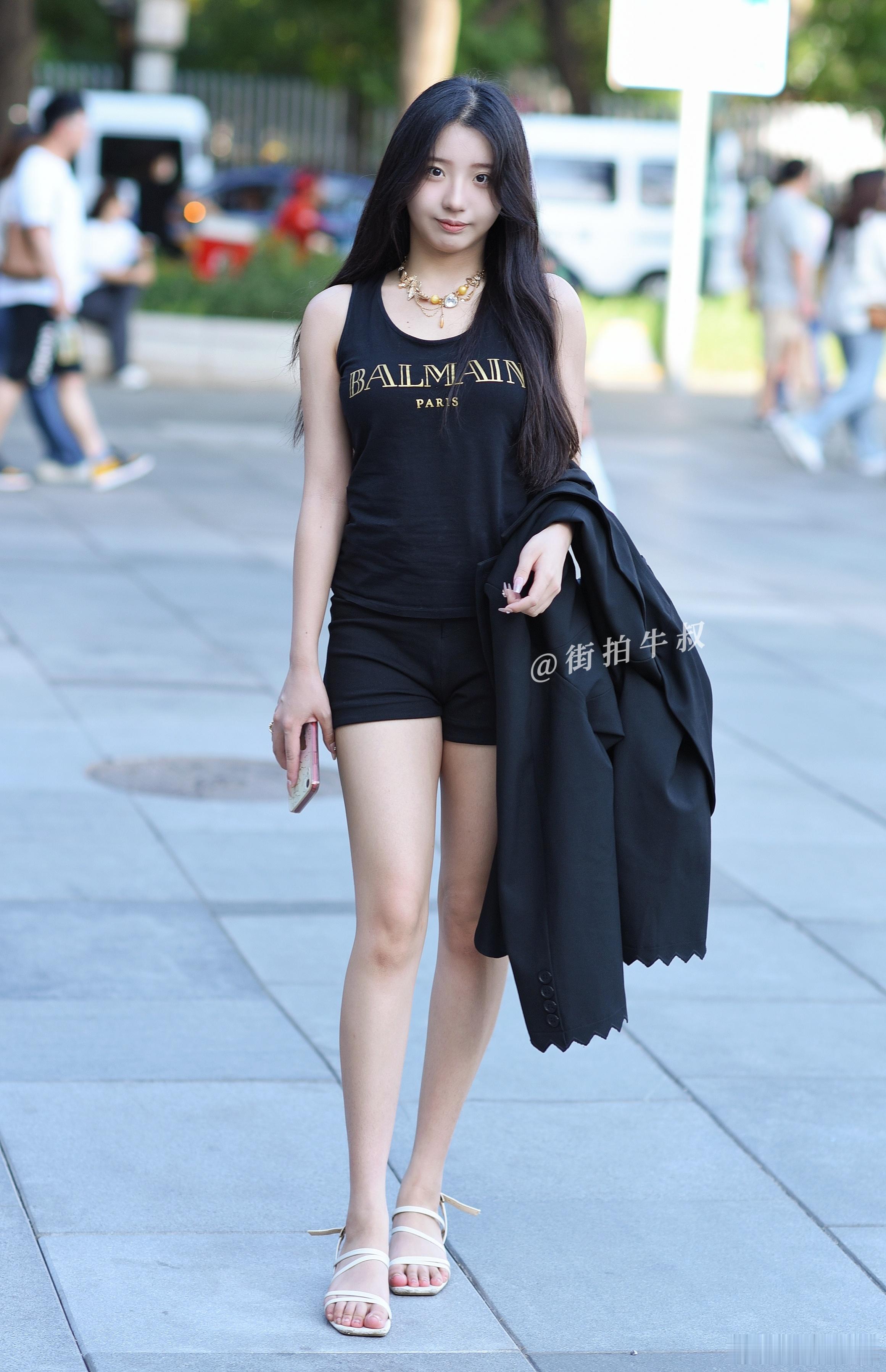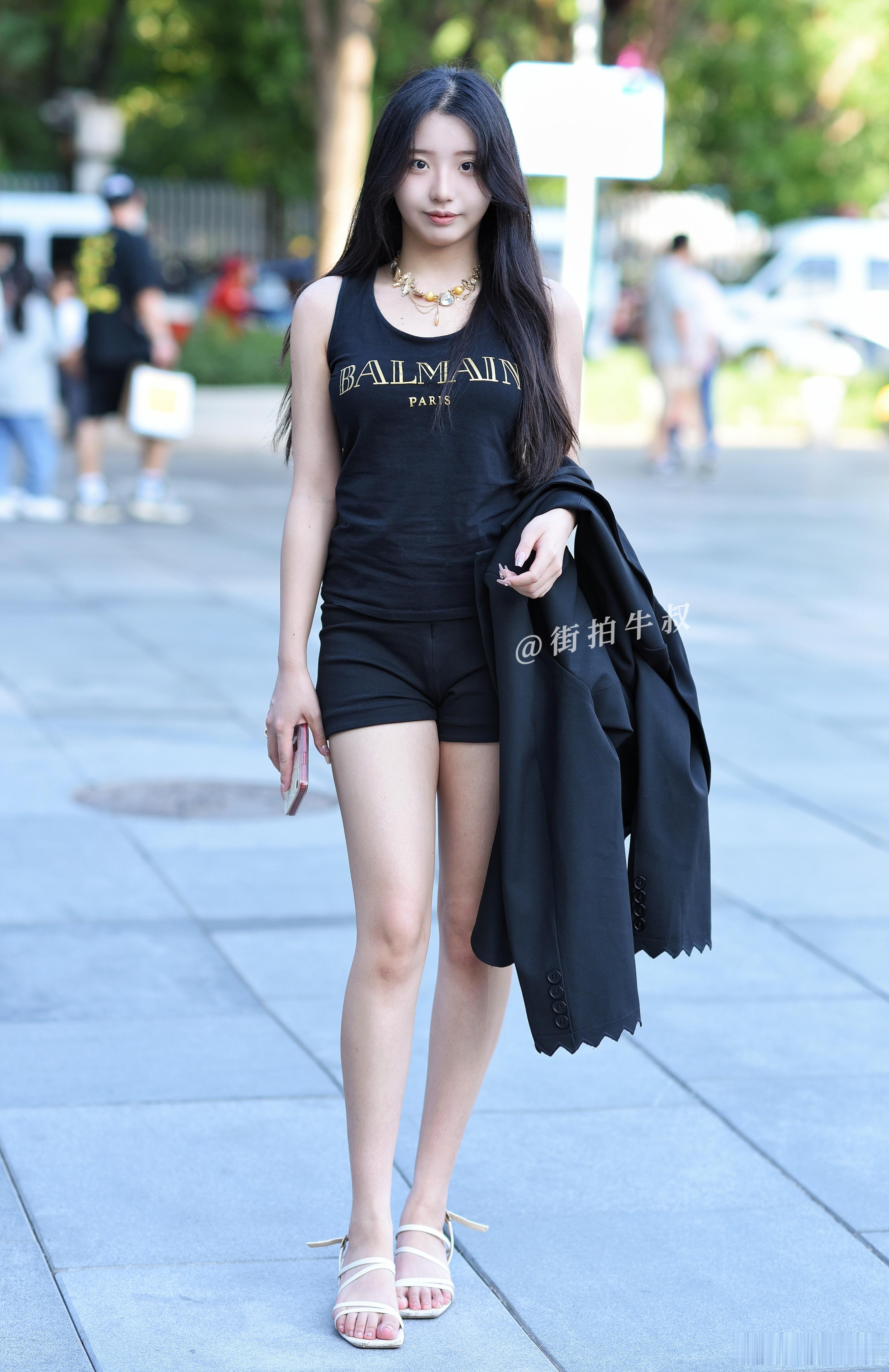 白背心+灰背带短裤,街头元气感拉满简约白背心搭灰牛仔背带短裤,毛边裤脚添了