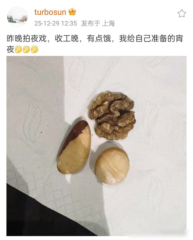 孙俪发微博分享自己的宵夜,点开图给我看呆了,这就是女明星的自律吗,当演员也挺不容易的 事情是这样的,娘娘刚拍完夜戏收工,估计是累狠了觉得肚子空,结果翻开她的动态一看,所谓的“深夜加餐”竟然只有可怜巴巴的三颗坚果。 一张简简单单的白纸巾上,就孤零零地摆着一个核桃、一个夏威夷果,还有一颗我硬是没认出来的品种,看着分量还没我塞牙缝的多。 说实话,普通人要是熬夜加班到这会儿,脑子里多半全是火锅麻辣烫,最起码也得整碗热气腾腾的泡面才对得起那份辛苦。 但她这种养生式的补给,更像是一种生理性的精准“充电”,这种对食欲的绝对压制真的挺让人服气的。 我觉得这种自律不仅仅是为了上镜好看,更像是一种职业素养的肌肉记忆,把身体当成精密仪器在保养,绝不多加一点负担。 很多人总觉得明星光鲜亮丽,但看完这几颗坚果我才意识到,这种十年如一日的克制其实挺折磨人的,没有极强的意志力根本坚持不下来。 可能这就是她能一直红的原因吧,能在最细微的欲望面前对自己下狠手,这种狠劲换到哪个行当估计都是顶尖的。