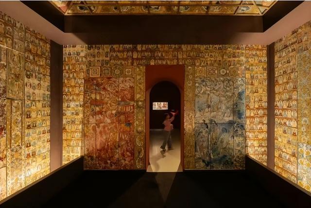 展览中,敦煌莫高窟第328窟官方等比例复制窟首次入赣展出,《丝路传奇·青花大盘》震撼亮相,上千块景德镇陶瓷搭建的高温颜色釉瓷窟装置,将飞天、九色鹿、藻井等敦煌经典意象以瓷板画、雕塑等多元形式呈现,每一件作品都是自带氛围感的打卡点。更有流失海外的敦煌壁画临摹作品集中展示,釉料窑变形成的流光溢彩与斑驳肌理,让千年敦煌艺术在瓷上获得永恒生命力。