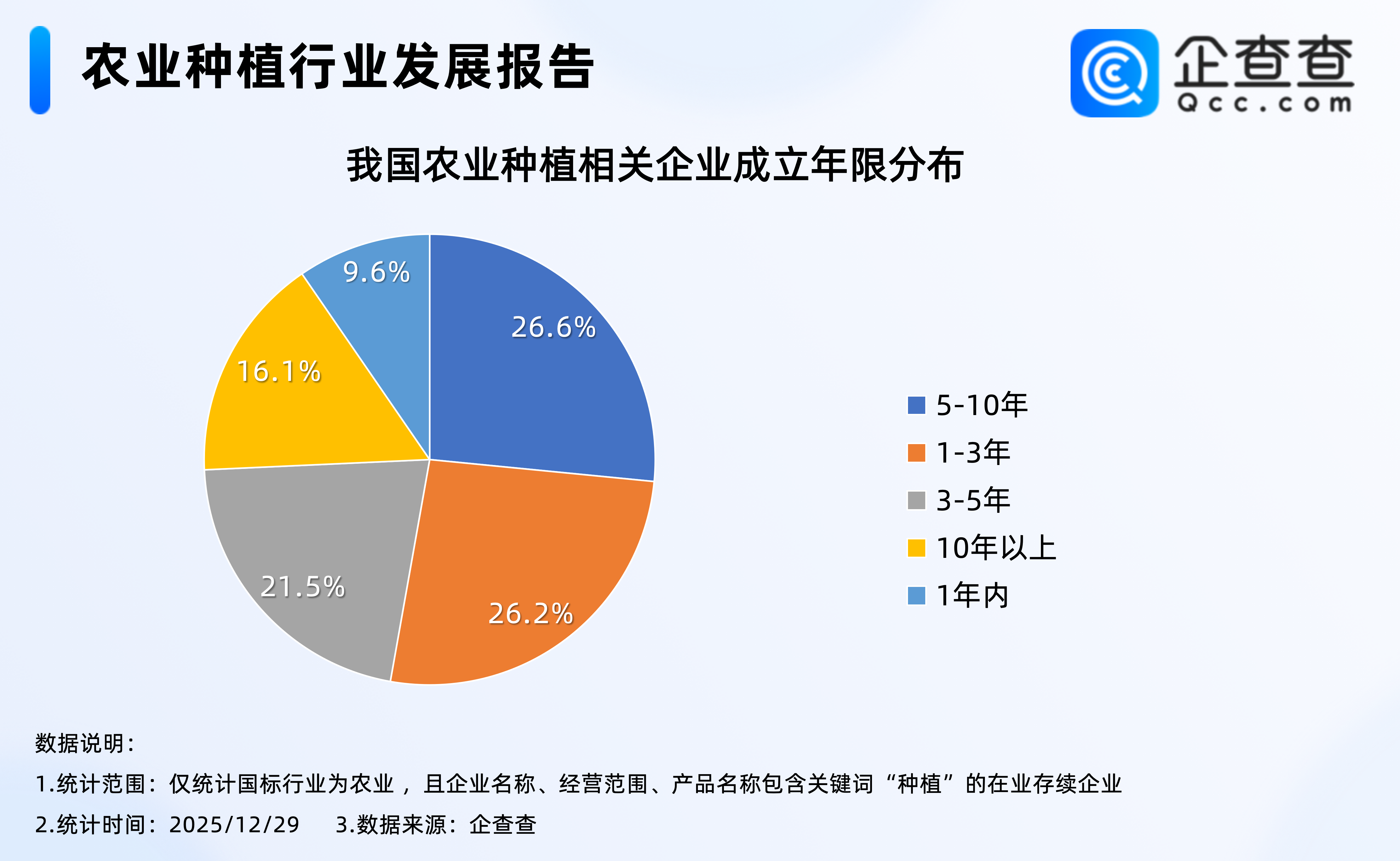 企查查数据显示,成立年限方面,我国农业种植相关现存企业中,成立5至10年之间的企业最多,占比26.6%,其次是成立1至3年之间的企业,占比26.2%,成立1年内的企业相对最少,占比9.6%。