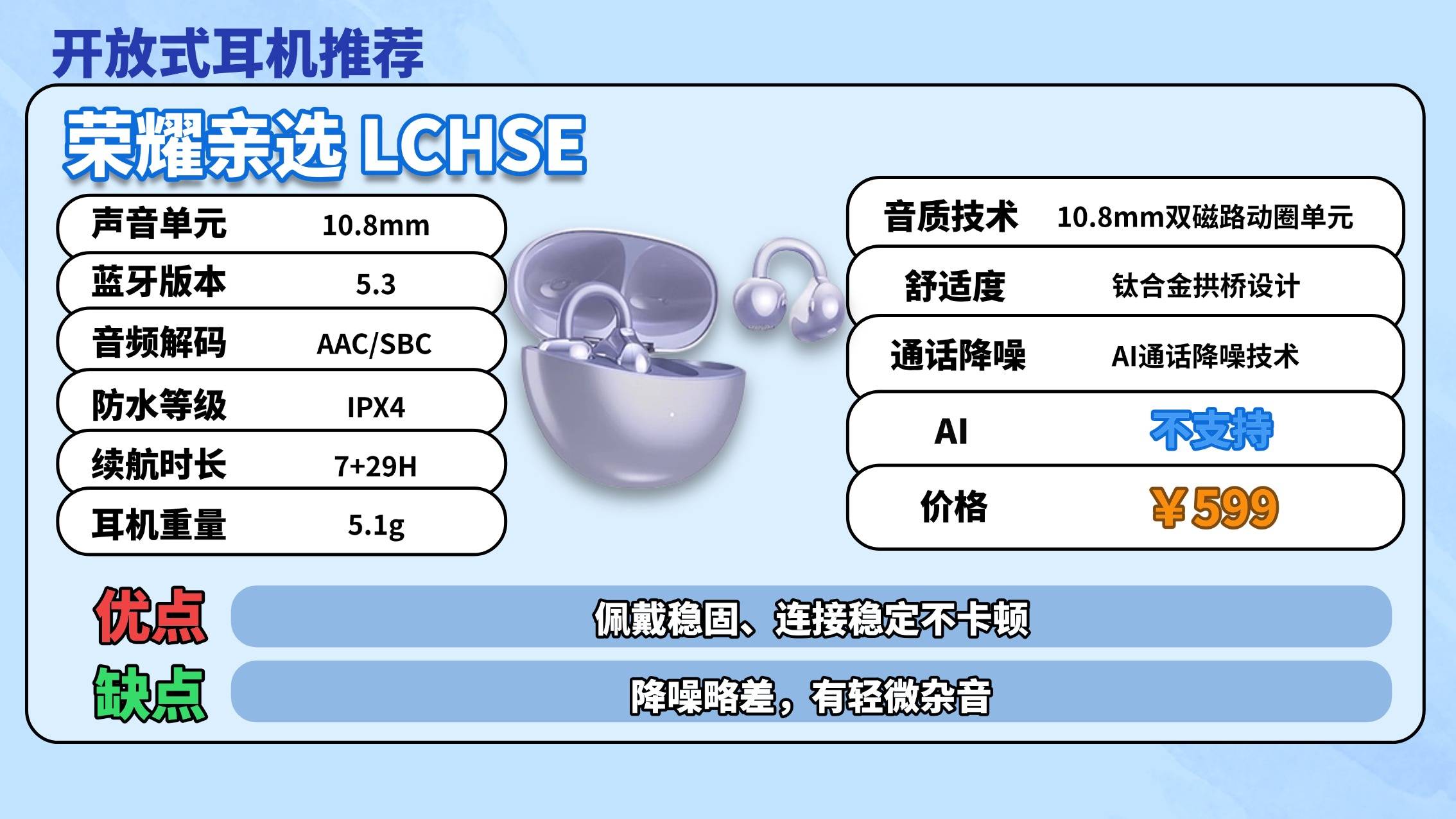 音质表现上,荣耀LCHSE耳机搭载10.8mm双磁路动圈单元,搭配PEEK+PEN镀钛振膜,高音呈现清澈通透、毫无刺耳感,低音则兼具动感与细腻度。配合动态低音增强技术与空间环绕声算法,音乐播放时的立体感十分突出。