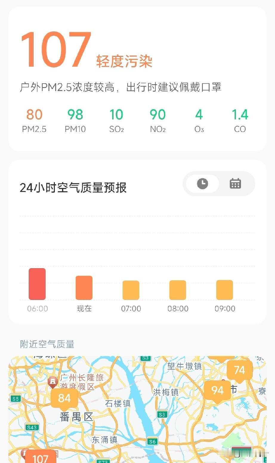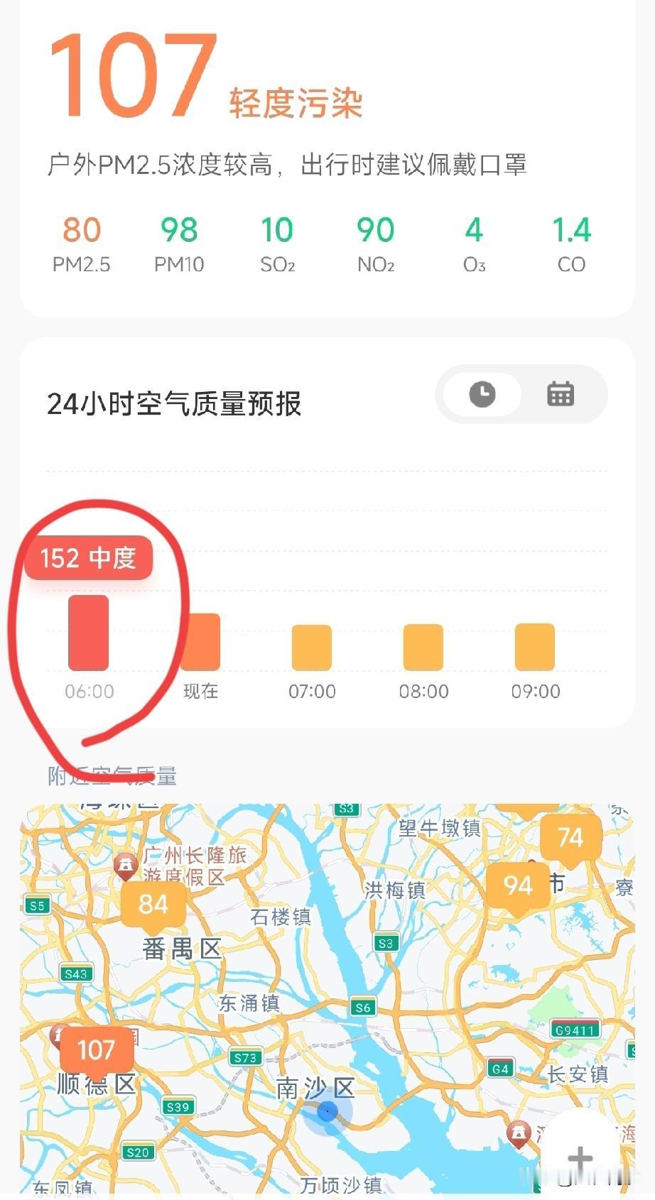 继续关注南沙空气质量问题,今天早上起来还是灰蒙蒙一片,不过终于是没有焦味了。 打开天气 app 一看,竟然爆表了。6点多的时候是中度污染,7点多是轻度污染。 可以看到爆表最厉害的是 pm2.5,也就是空气悬浮粒子。 不过整个珠三角都差不多,尤其是中山同样是轻度污染。感觉南沙一整年的绿美滤镜,在11月和12月都被打破了,11月广州全市最差,12月我估计也不会太好。 早起的亲们最好戴个口罩吧,然后轻度污染最好就不要晨运了哦!