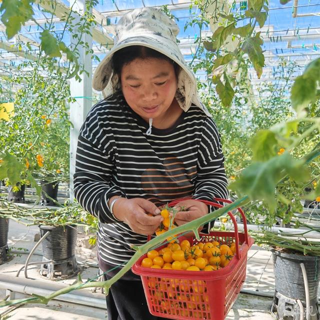 来自通甸镇丰华村的女工们在不同的工作区域忙碌着:有的站在高高的作业车上专注授粉;有的则快速、娴熟地采摘着果实。不远处的包装车间里,工人们正进行分拣、称重、打包。这些带着高原晨露的樱桃番茄,转眼将踏上发往全国各地的旅程。