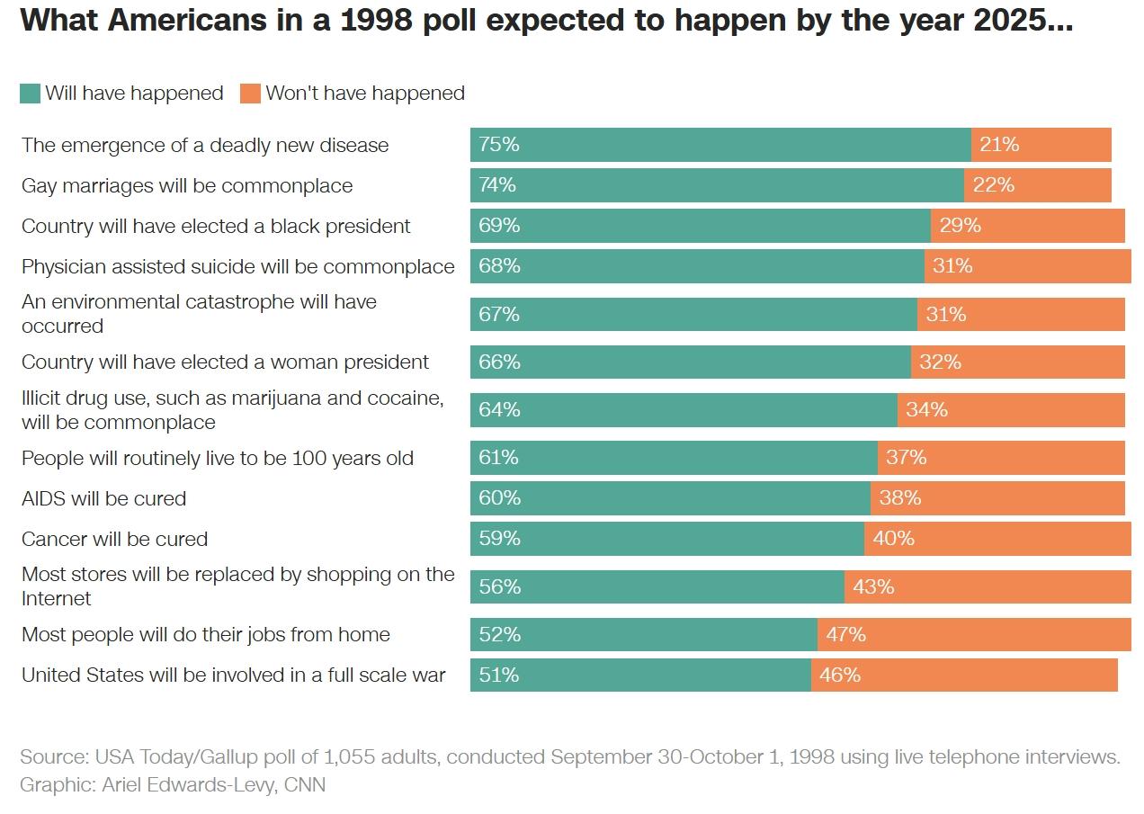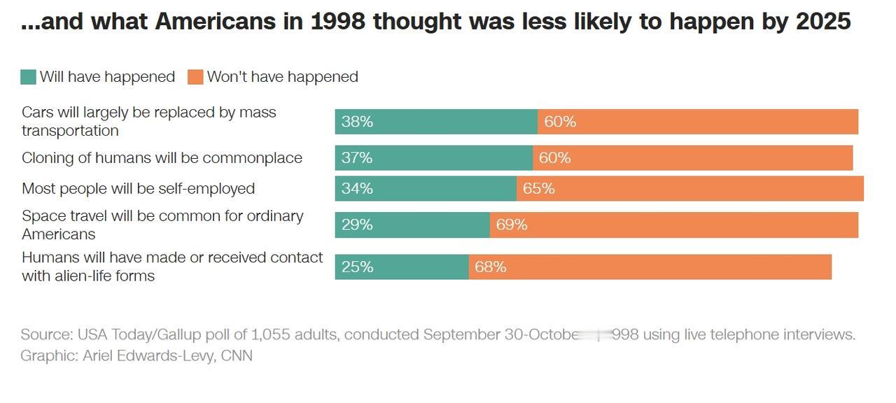 回顾一下1998年美国人对2025年的预测,有多少已变成现实 1998年,比尔·克林顿面临弹劾程序,《泰坦尼克号》在奥斯卡大放异彩,大多数家庭仍有座机电话。盖洛普和《今日美国》通过这些座机联系了1055名美国人,询问他们对遥远未来——2025年的最佳预测。 这些预测现已通过康奈尔大学罗珀中心维护的民调档案得以保存,随着2025年的最后几天渐渐过去,以下是回顾其中一些预测的表现。 1998年,大多数美国人预测,在接下来的27年里,国家将选出一位黑人总统,同性婚姻将合法且普遍,一种“致命的新疾病”将会出现。 大多数人预测普通美国人会普遍进行太空旅行,或者外星生命会与他们接触。 还有大约三分之二的美国人认为美国会选出女性总统。超过一半的人预期癌症会治愈,61%的人预计“人们会常常活到100岁”。 70%的人认为富人的生活质量会改善,但受访者对中产阶级的状况会改善还是更糟持分歧,大多数人预计穷人的生活会变得更糟。近八成的人预计未来美国人的个人隐私会减少,57%的人认为他们会体验到更少的个人自由。大多数人还预期犯罪率更高、环境质量较差和道德价值观较低。71%的多数人认为,培养孩子成为好人会更难。 大多数人认为种族关系会改善,医疗服务会更易获得,虽然费用会降低。 当时约60%的美国人表示对美国现状感到满意,现如今,这一比例为24%。
