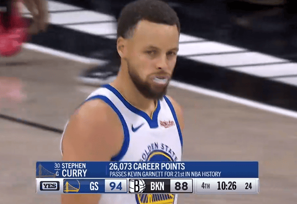 比赛的第四节,库里三分命中,生涯总得分来到26073分超越加内特位居历史第21位。