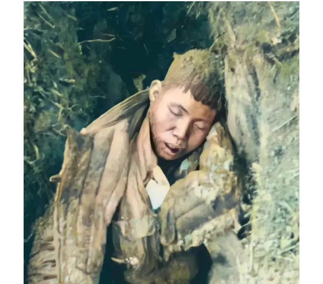 1950年,长津湖战役中,一名被冻死的志愿军战士,他生前是志愿军第九兵团的士兵,由于年代久远,我们无法确定他的姓名。 雪粒子像沙子一样砸在脸上,盖马高原的风卷着雪沫灌进单薄的棉衣。 当战友们在清理阵地时,发现他趴在雪地里,步枪还架在冻土上,枪管上结着厚厚的冰壳,手指冻得和扳机粘在了一起,掰都掰不开。 第九兵团入朝时,很多战士还穿着华东地区的薄棉衣。 后勤部长后来在报告里写,全军三分之二的人没有棉帽和手套,汽车队刚过鸭绿江就被美军飞机炸了六成。 11月底的长津湖,气温跌到零下四十度,胶鞋踩在雪地里,鞋底很快就冻硬,走一步滑一下,不少人脚踝都磨破了,血珠渗出来瞬间就结成了冰碴。 他遗体旁放着个瘪了的炒面袋,袋口还沾着点没吃完的粉末。 那会儿志愿军一天只能分到三两炒面,掺着雪水往嘴里送。 27军80师的周全弟后来回忆,全连一百二十九人,最后冻得站不起来的就有一百二十五人,有人腿冻肿得像水桶,还咬着牙往枪膛里塞子弹。 11月27号晚上,第九兵团突然向美军发起进攻。 新兴里的战斗里,27军把"北极熊团"全歼了,团旗都给缴了回来。 柳潭里那边,陆战一师的史密斯喊着"向南进攻",其实是边打边退。 他所在的部队可能守在1081高地,负责堵截美军的"德赖斯代尔支队"。 三天三夜,阵地没丢,可等大部队上来时,雪地里只剩下一排排冻僵的身影。 美军军医在日记里写,从没见过这样的士兵冻得脸发紫,睫毛上全是白霜,却还保持着卧倒射击的姿势。 人体在零下二十五度暴露一小时就可能冻伤,他们每天吃的东西连八百大卡都不到,还不够美军士兵一顿的热量。 可即便这样,没人后退,有人冻掉了手指,就用胳膊夹着枪打。 后来在整理冰雕连遗物时,发现过一张纸条,上面写着"冰雪啊,我绝不屈服于你"。 20军的王法礼老兵说,他们连里有个小战士,口袋里揣着个冻土豆,到最后都没舍得吃,硬邦邦的土豆上还留着牙印。 陆战一师的士兵威廉·德雷斯在回忆录里说,那天他们对着这些"冰雕"敬了礼,"他们是真正的军人"。 现在军事博物馆里还放着一只当年的胶鞋,鞋面裂了好几个口子,鞋底沾着的雪块像焊在上面一样。 看着这只鞋,我觉得这不仅仅是件旧物,而是那个冬天里最沉的秤砣,称出了"钢少气多"四个字到底有多重。 他和其他冰雕连的战士们,用冻僵的手指握紧步枪,在零下四十度的雪地里,给身后的祖国撑起了一片没有硝烟的天空。 去年去长津湖烈士陵园,看到石碑上刻着"无名烈士"四个字。 风从碑前吹过,像极了当年战壕里的风声。 旁边放着束野菊花,花瓣上还沾着雪,不知道是谁放的。 但我知道,只要这风还在吹,总有人记得,七十多年前有群年轻人,把生命留在了这片冰雪里,只为让后来者能在暖屋子里吃顿热乎饭。