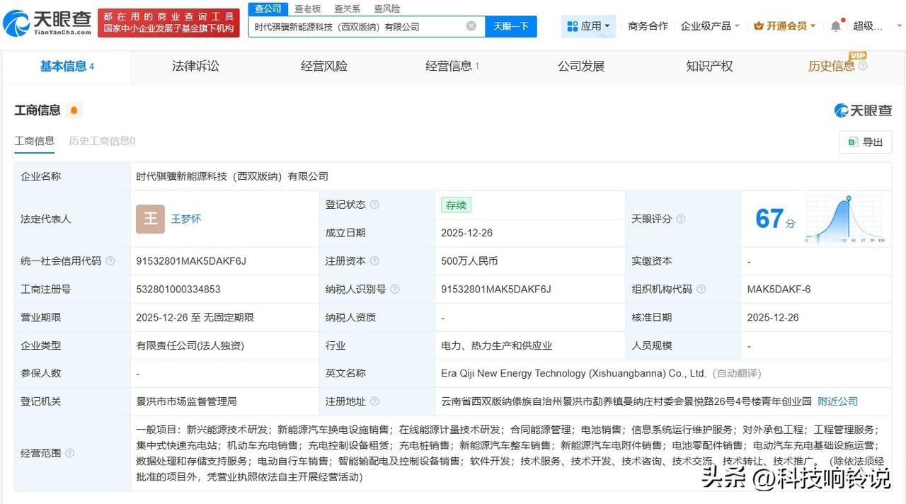 【宁德时代在西双版纳成立新能源科技公司 注册资本500万】 天眼查App显示,近日,时代骐骥新能源科技(西双版纳)有限公司成立,法定代表人为王梦怀,注册资本500万人民币,经营范围包括新兴能源技术研发、新能源汽车换电设施销售、新能源汽车整车销售等。股东信息显示,该公司由时代骐骥绿能科技(昆明)有限公司全资持股。 天眼查信息: