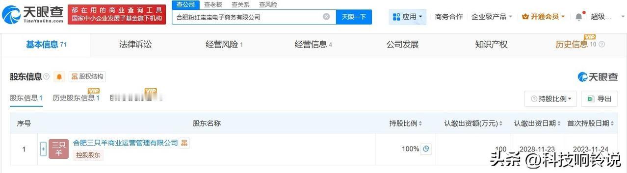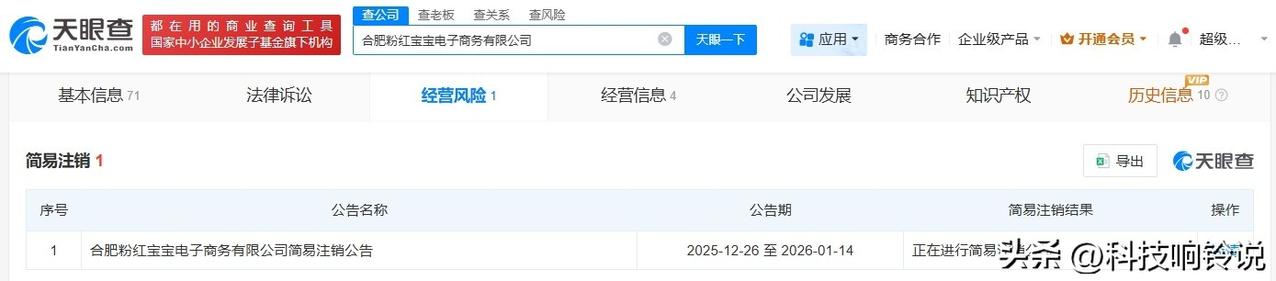 【三只羊旗下粉红宝宝电商公司拟注销 三只羊接连注销旗下公司】 天眼查App显示,近日,合肥粉红宝宝电子商务有限公司新增1条简易注销公告,公告期为2025年12月26日至2026年1月14日。 该公司成立于2023年11月,法定代表人为李莹,注册资本100万人民币,经营范围包括个人商务服务、个人互联网直播服务、组织文化艺术交流活动、文化娱乐经纪人服务等。股东信息显示,该公司由合肥三只羊商业运营管理有限公司全资持股。值得注意的是,三只羊旗下合肥欧普三羊科技有限公司也于近期注销。 天眼查信息: