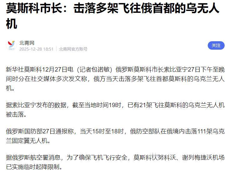 惨烈!莫斯科遭大规模轰炸,空中交通陷入瘫痪,超300架航班被迫取消或发生延误,70架飞机转移。 根据俄罗斯国防部12月27日发布的官方通报,当天15时至18时许,俄防空部队在本国境内展开紧急拦截行动,成功击落111架乌克兰固定翼无人机。 与此同时,莫斯科市长索比亚宁也在社交媒体上多次发文,披露有多架飞往莫斯科的乌克兰无人机被击落,及时向公众通报事态进展以稳定情绪。 尽管防空部队全力阻击,但此次袭击仍对莫斯科的核心交通枢纽造成了严重冲击。为了保障飞机飞行安全,避免无人机袭击带来的二次风险,俄罗斯航空署紧急发布通知,莫斯科的伏努科沃机场和谢列梅捷沃机场随即实施临时起降限制。 这两座机场都是莫斯科的重要航空枢纽,承担着大量国内和国际航班的起降任务,临时限制措施一经实施,立刻引发连锁反应。 据俄罗斯新闻社报道,当天超300架航班因起降限制被迫取消或发生延误,还有70架飞机为避险不得不转移至其他机场降落。 机场内的景象更是混乱不堪,原本有序的航站楼里挤满了滞留的旅客。不少人拿着行李在登机口焦急等待,有的旅客围在航班信息显示屏前查看最新通知,还有的人忙着联系航空公司办理退票或改签手续。 对于很多计划出行的人来说,这次突发状况打了他们一个措手不及,有人是要返乡探亲,有人是商务出行,还有人是外出旅游,所有的安排都因为这场袭击被打乱。 就在袭击发生的前一天,也就是12月26日夜间至27日凌晨,俄军刚刚对乌克兰首都基辅发动了大规模空袭,动用了包括“匕首”高超音速导弹在内的武器,打击目标直指基辅的能源设施等关键部位。 那次空袭导致基辅全城停电停暖,还造成了人员伤亡,防空警报持续响了十几个小时才解除。外界普遍认为,乌克兰此次对莫斯科发动大规模无人机袭击,是对俄军空袭基辅的报复行动。 更关键的是,这一轮攻防交锋还叠加了敏感的外交时间窗口,乌克兰总统泽连斯基计划前往美国与美国总统会晤,磋商安全保障、和平计划推进等核心议题。 俄军此前的空袭被认为是为了施加战场压力,干扰美乌会晤议程,而乌克兰的报复性袭击,则是为了向国际社会证明自身具备反击俄罗斯本土的实力,同时争取西方更多的支持。 此次事件也让人们再次看到,俄乌冲突的影响早已超出战场范畴,开始深度波及普通民众的正常生活。空中交通的瘫痪不仅影响了旅客出行,还对当地的物流运输、经济交流等方面造成了负面影响。 截至12月28日,莫斯科两座机场的临时起降限制才逐步解除,部分航班开始恢复运营,但滞留旅客的安置和后续航班的衔接梳理仍需要一定时间才能完成。 俄罗斯方面也表示,会进一步强化防空体系建设,保障本土关键设施和民众的安全,而可以预见的是,俄罗斯军方势必还要进行报复性反击。 而这场突发的无人机袭击,让莫斯科这座城市经历了一场紧张的考验,也让国际社会更加关注俄乌冲突的走向。