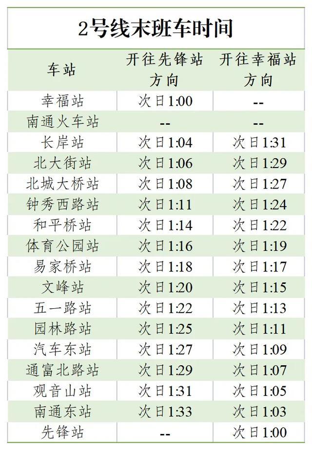 为便利市民跨年夜出行,2025年12月31日,南通轨道交通1、2号线全线运营服务延长3小时,首末站末班车发车时间调整至次日凌晨1:00。运营期间,南通轨交将根据客流情况灵活调整行车间隔,请乘客关注1、2号换乘截止时间,在工作人员的指引下有序乘车。