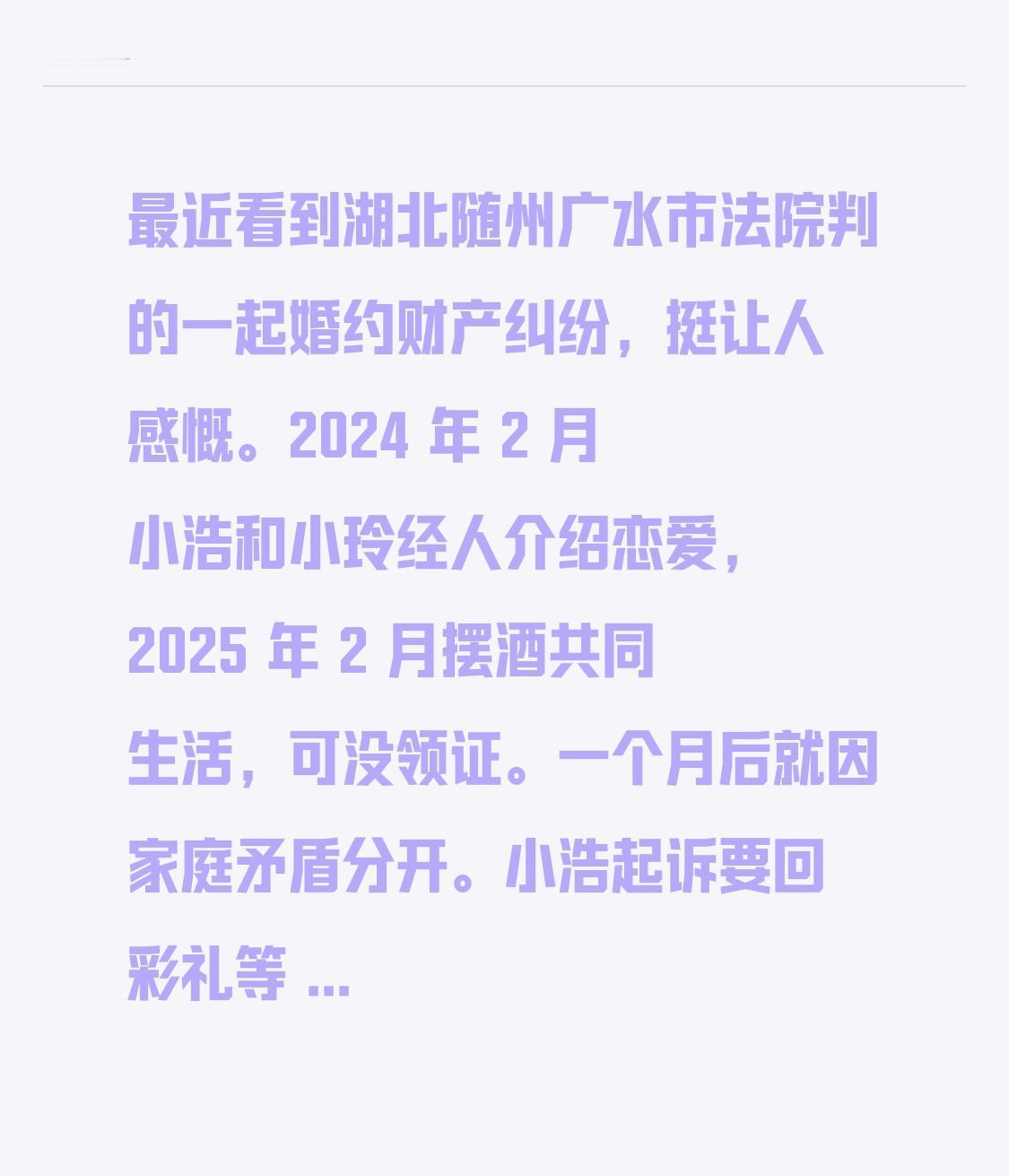 最近看到湖北随州广水市法院判的一起婚约财产纠纷,挺让人感慨。2024 年 2 月小浩和小玲经人介绍恋爱,2025 年 2 月摆酒共同生活,可没领证。一个月后就因家庭矛盾分开。小浩起诉要回彩礼等 30 多万。 法院认定,恋爱时的一般赠与和共同生活开销不算彩礼,彩礼范围的款项共 21.8 万。考虑没登记但办了婚礼、有共同生活等情况,最后判小玲返还 20 万。这判决挺合理,既保障了男方权益,也考虑到女方实际情况。这也给大家提个醒,结婚不是小事,领证很重要。