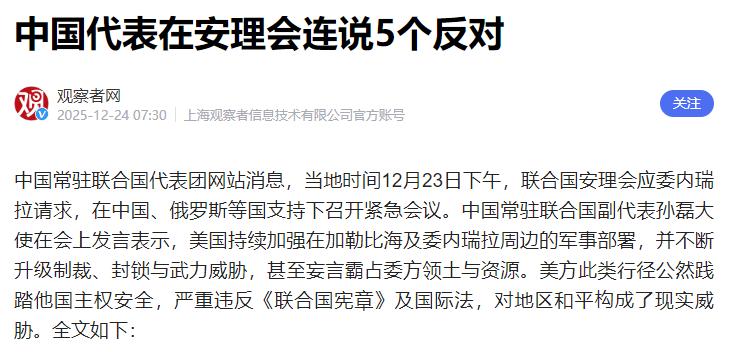 这一次,中美连“演一下”都懒得演了。 12月23日,在委内瑞拉的请求下,联合国紧急召开会议。 和以往国际交往中多少会保留的外交缓冲不同,这一次中美两国都没打算“演”,美方直白亮明霸权态度,中方则用最坚定的姿态正面回应,把分歧放在了明面上。 简单说就是,美国公开不承认委内瑞拉马杜罗政府,放话要动“一切手段”施压;中方当场用五个“反对”逐条反驳,直指关键:要是国际规则能随便被打破,那这个世界就只剩强者说了算,根本没公平可言。 会上,美国代表一开口就态度强硬,给马杜罗政府安了好几项罪名,说人家选举不合法、和贩毒有关联、还支持恐怖主义,全是为自己后续施压找的借口。 可这些说法根本站不住脚——不少国际观察团都认可委内瑞拉之前选举的合法性,美国说人家是“贩毒通道”,却拿不出实打实的证据;所谓“支持恐怖主义”,更是没凭没据的抹黑,明眼人都能看出来,这些都是美国想插手委内瑞拉事务的由头。 近几个月,美国借着“打击贩毒”的名义,在加勒比海和东太平洋一带不断增加军事力量,不仅扣了委内瑞拉的油轮,还大言不惭地说要把扣下来的船和石油收归自己国家储备,甚至暗示有可能对委内瑞拉动武。 而美国这次在联合国的表态,不过是把自己的霸权野心彻底说透了,说到底还是盯上了委内瑞拉丰富的石油资源,想把这个拉美国家当成自己的“后花园”,想怎么管就怎么管。 面对美国这样的嚣张态度,中方没有半点退让,当场用五个“反对”把美方的说法一一驳回,每一句都掷地有声。 中国常驻联合国副代表明确表示,美国做的这些事,根本就是侵犯别的国家的主权和利益,违反了《联合国宪章》和国际法,还严重威胁到了拉美地区的和平与安全。 这五个“反对”不是随便说的,每一条都戳中了美国霸权的要害:反对一切单边霸凌行径,支持各国捍卫自身主权和民族尊严;反对任何违反联合国宪章宗旨和原则,侵犯别国主权安全的行为;反对在国际关系中,使用或威胁使用武力;反对外部势力以任何借口,干涉委内瑞拉内政;反对缺乏国际法依据、未经安理会授权的非法单边制裁和"长臂管辖"。 我们这次强硬发声,不只是帮委内瑞拉说话,更是在维护整个国际社会的公平正义。 其实美国的霸道做法,早就有很多国家看不惯了。 这次会议上,俄罗斯代表直接指责美国扣油轮、搞封锁的行为是侵略,违反了所有国际法的核心准则;委内瑞拉代表也直言,美国的野心不止于委内瑞拉,是想霸占整个南美大陆,所谓的“毒品问题”“安全问题”全是借口,真正想要的是委内瑞拉的石油、矿产和土地。 就连美国的欧洲盟友法国,这次也没跟着美国走,反复强调要尊重各国主权,得通过外交谈判解决分歧,不愿意帮美国的霸权行为站台。 现在的世界,早就不是某一个国家说了算的时代了。美国要是非要一条道走到黑,继续搞霸权那一套,无视国际社会的正义声音,最后只会变成孤家寡人。