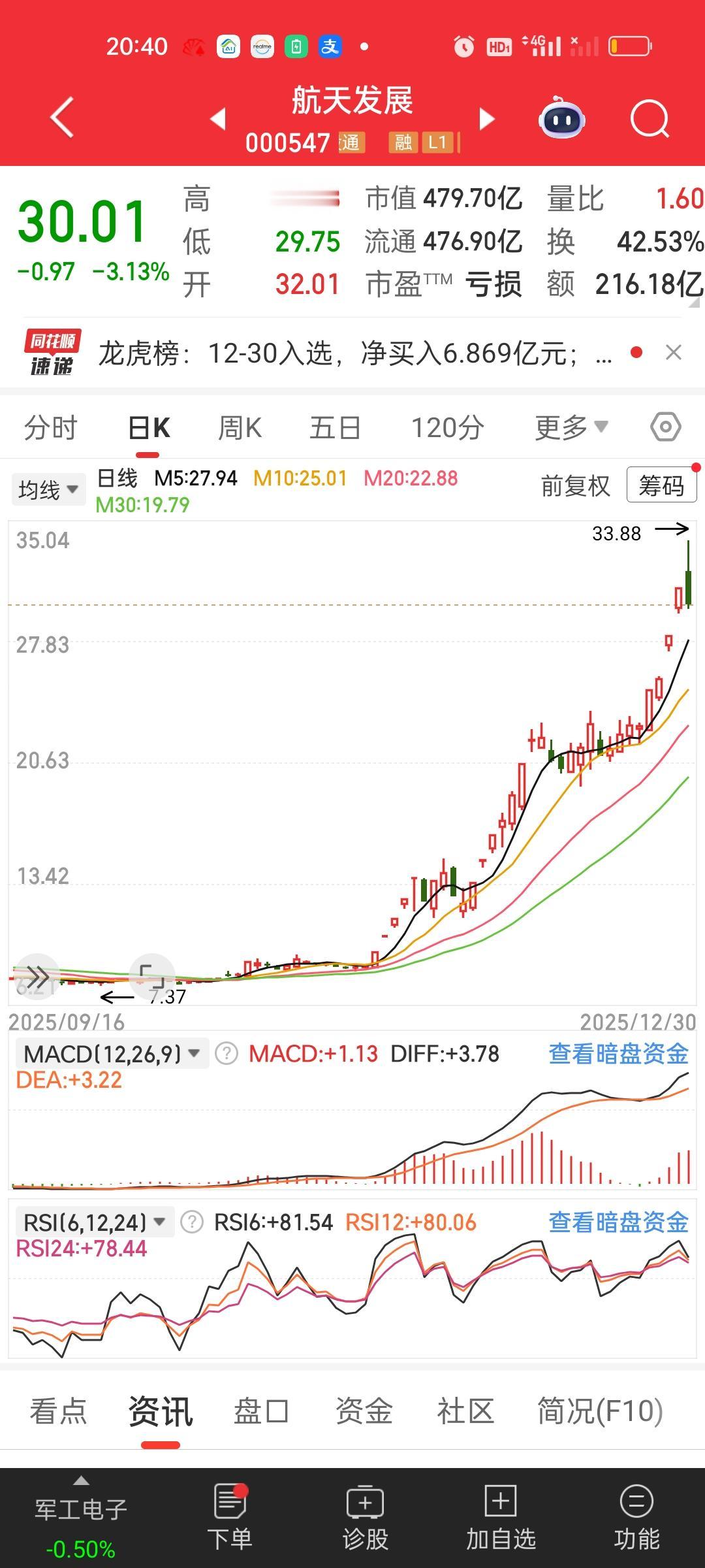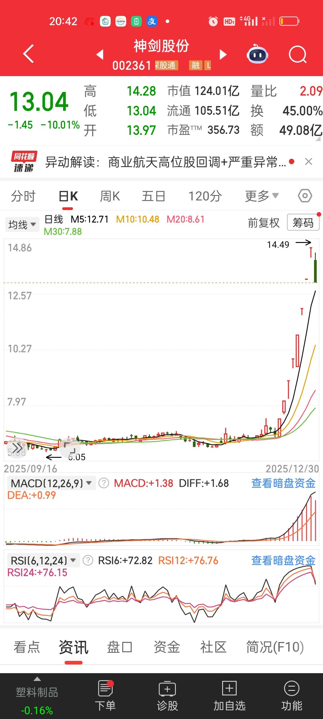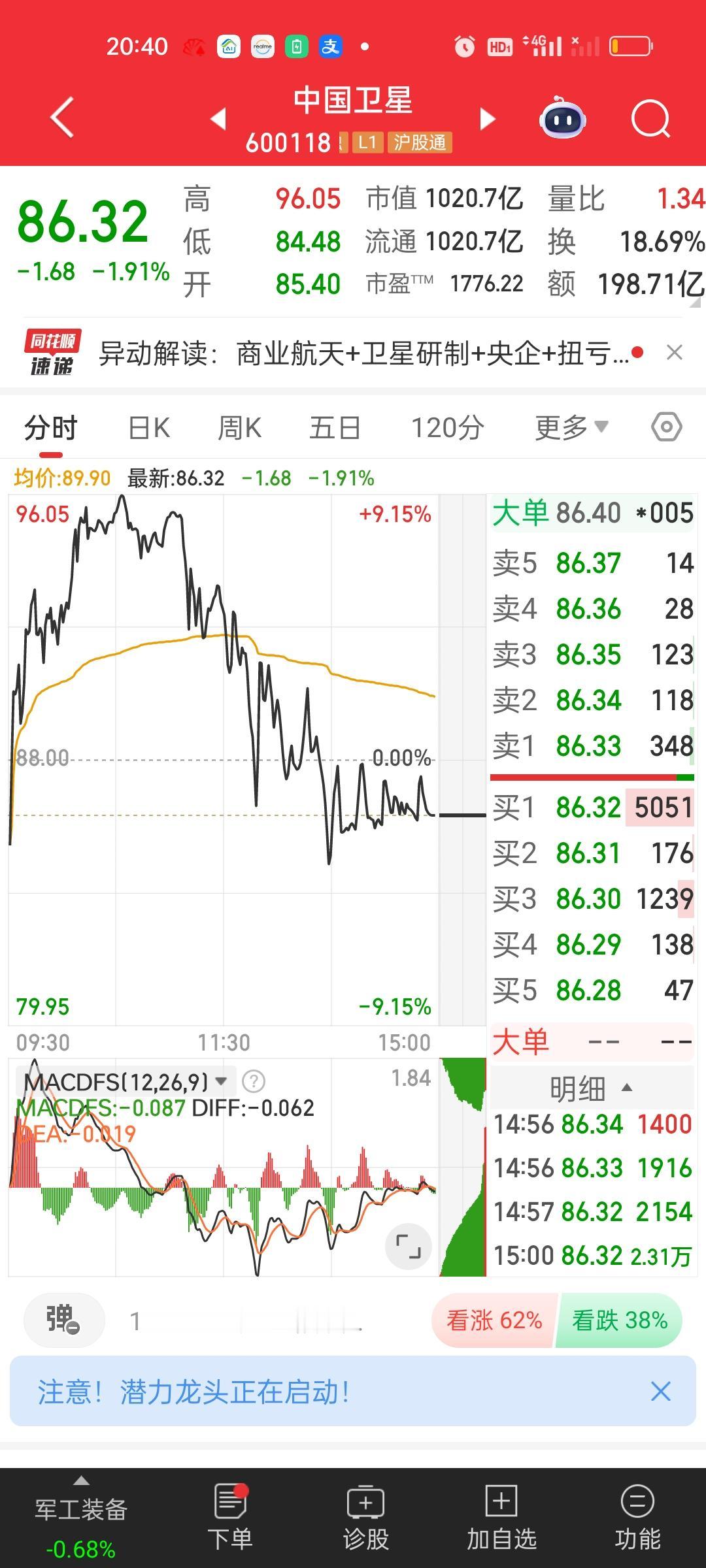大家有没有觉得商业航天板块里面的个股有做阶段性顶部的迹象啊?特别是今天这种放巨量的冲高回落。要重点关注明天能不能反包! 航天发展从接近涨停到收盘跌3.31%,中国卫星,航天机电,都是冲高回落高位跳水的走势。而再升科技和神剑股份和它们相比要弱势得多,特别是神剑,股价没兜住,直接来了个跌停。