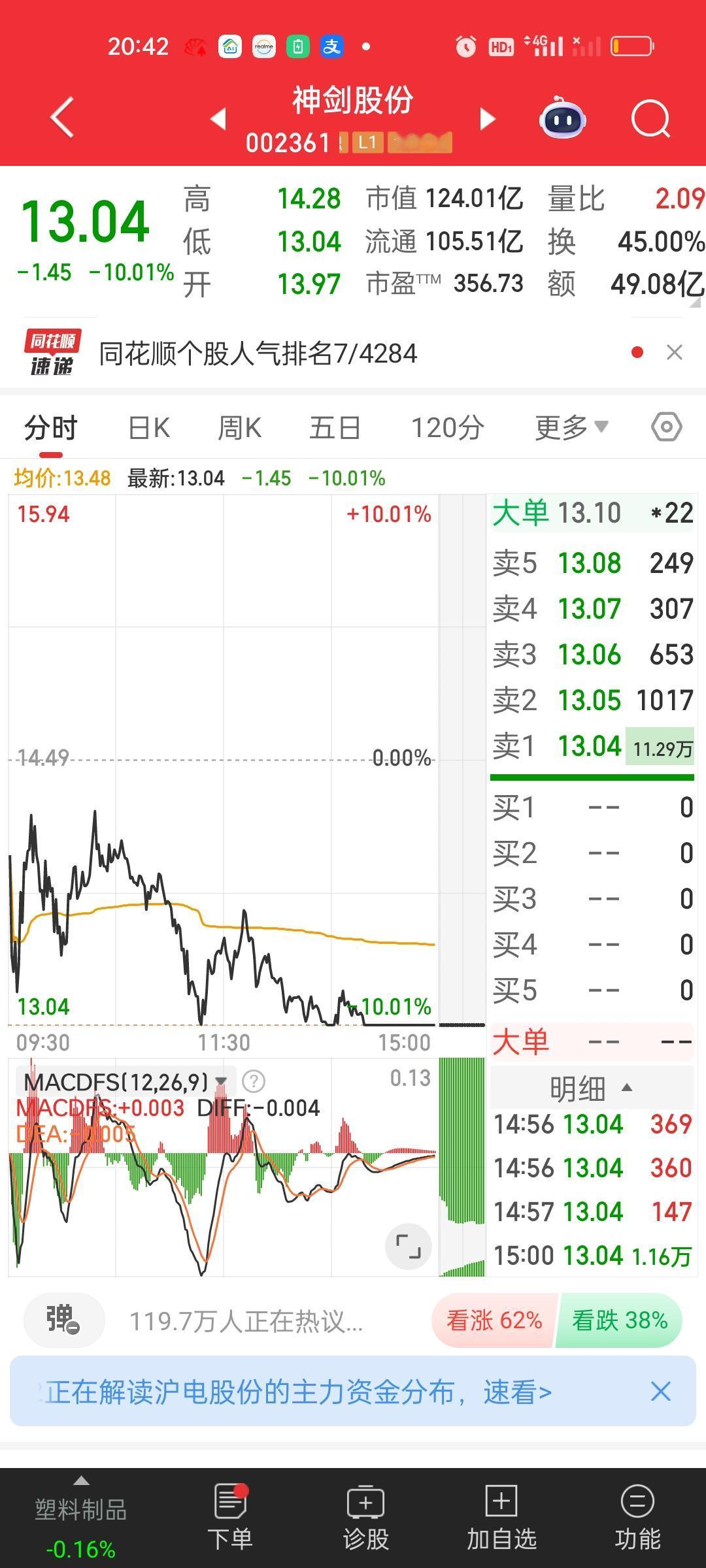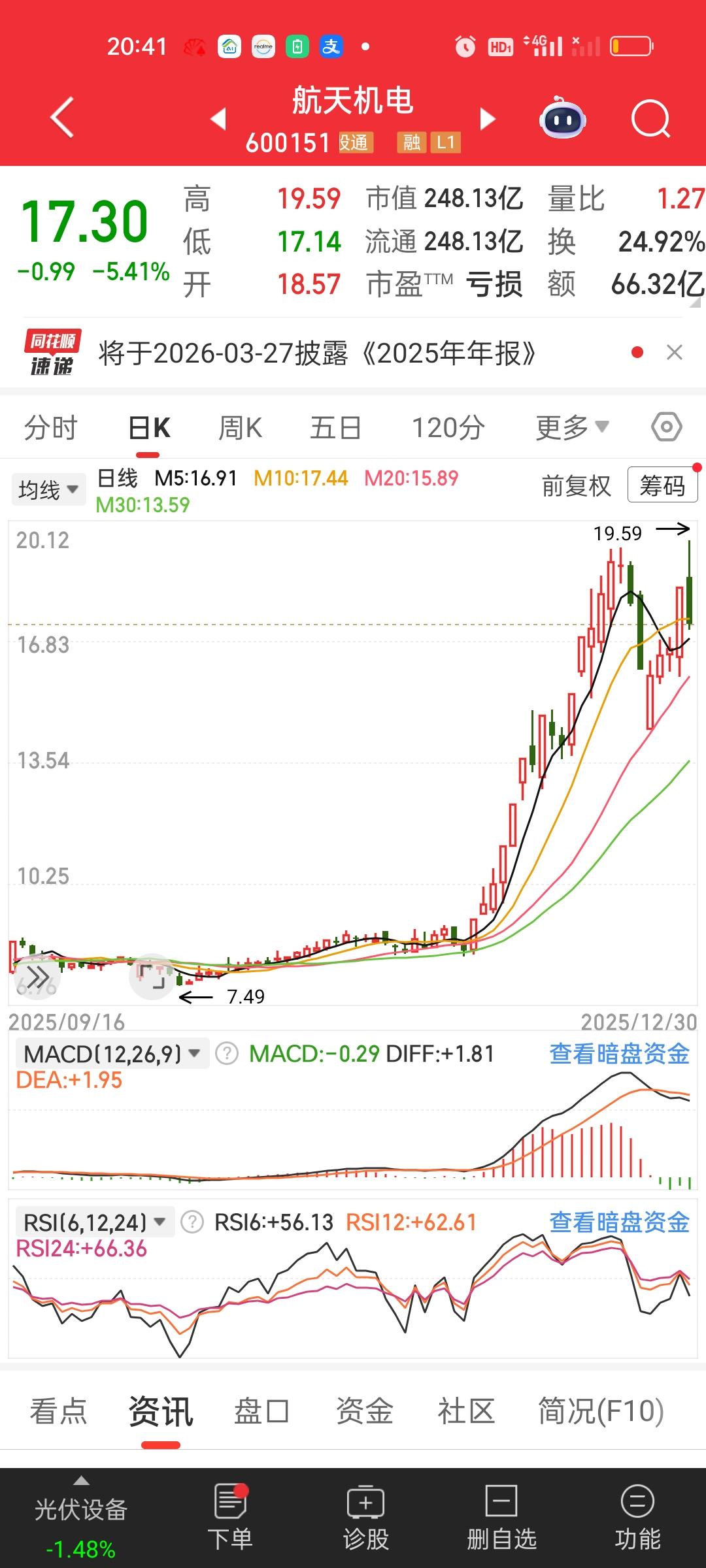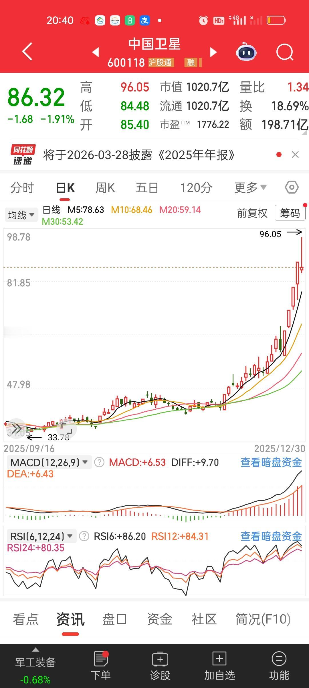 大家有没有觉得商业航天板块里面的个股有做阶段性顶部的迹象啊?特别是今天这种放巨量的冲高回落。要重点关注明天能不能反包! 航天发展从接近涨停到收盘跌3.31%,中国卫星,航天机电,都是冲高回落高位跳水的走势。而再升科技和神剑股份和它们相比要弱势得多,特别是神剑,股价没兜住,直接来了个跌停。