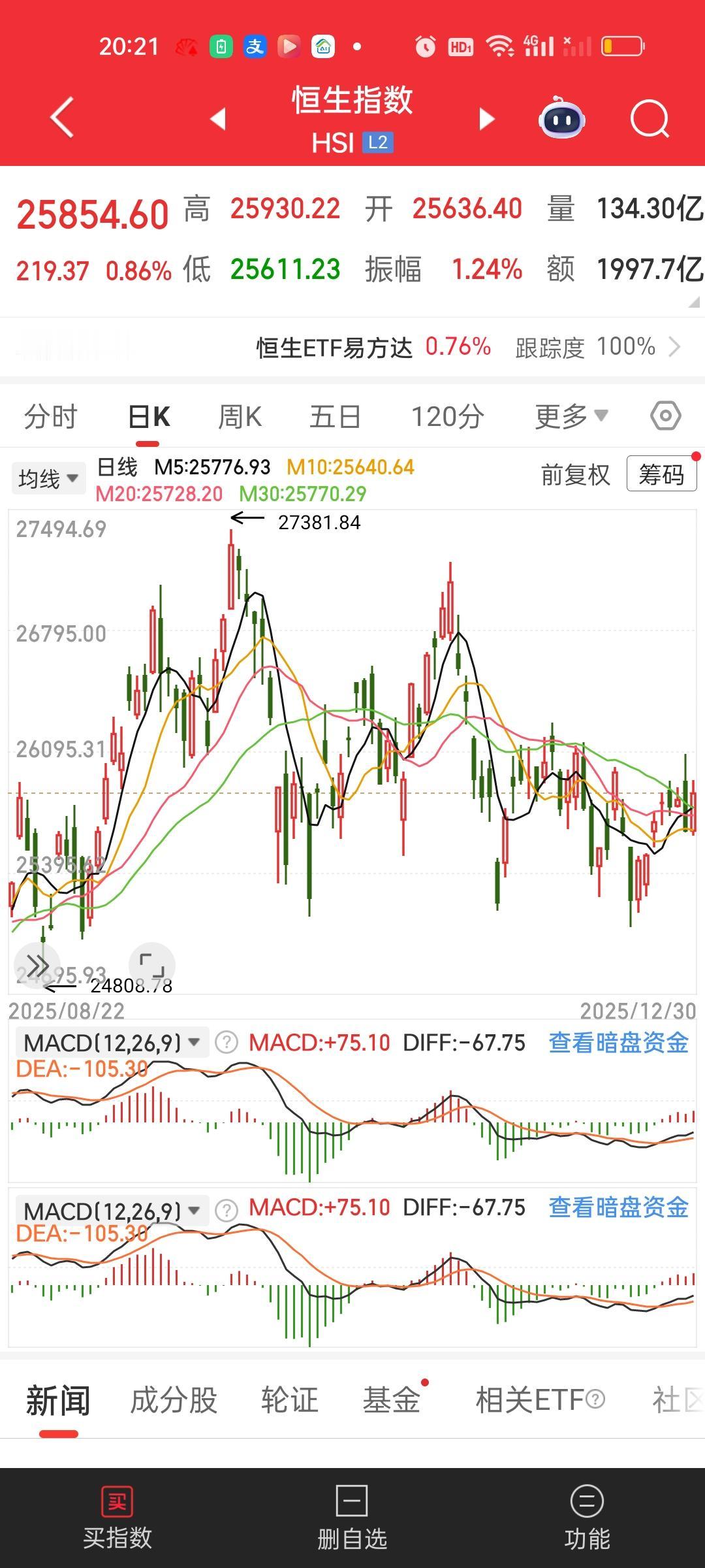 港股收盘算是走了一根阳包阴。恒指收盘站上了所有均线的上方,恒科也也一样,这就是强