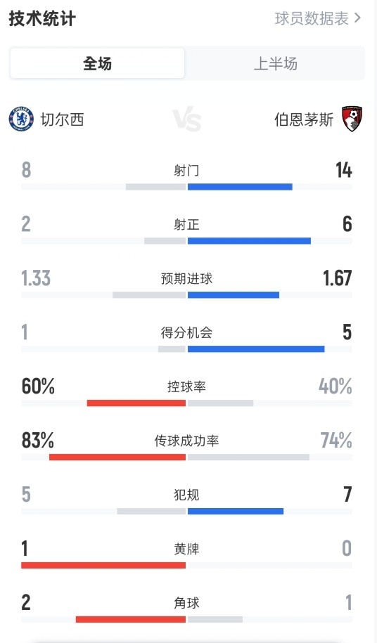 数据统计显示,本场比赛伯恩茅斯上半场完成了14次射门,这是他们在英超联赛客场比赛上半场射门次数的最高纪录。