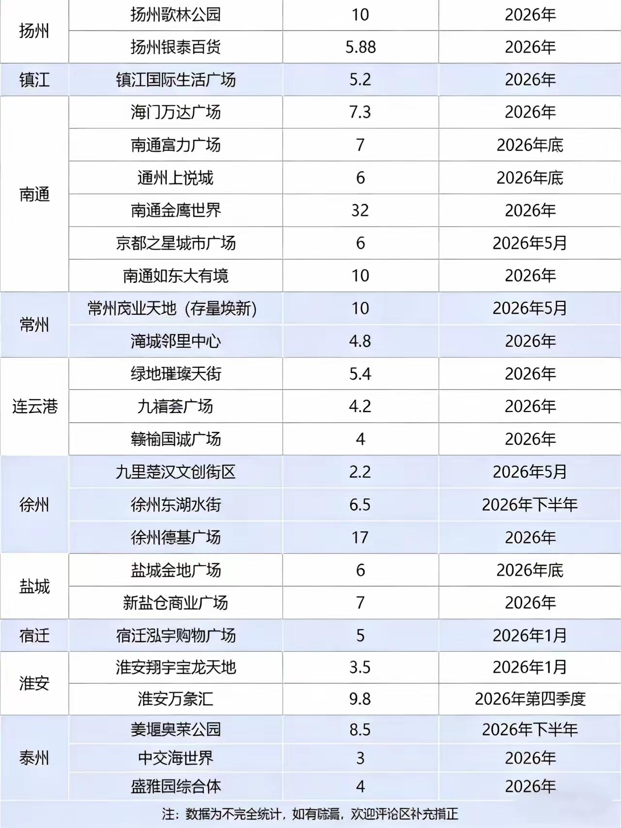 江苏 商业体 徐州筹开3座,不愧是苏北王。2026年,江苏计划筹备开业的商业项目达53座,且商业体量均超2万平方米。从城市分布来看,省会南京以14座商业体的筹开规模领跑全省。原计划于今年底开业的徐州德基广场,将延期至2026年开业。作为德基首个走出南京的商业体,它有望成为徐州商圈的新标杆。面积在全省最大。2026年,徐州有3座商业体筹开,盐城、淮安各2座,连云港3座,宿迁1座。 苏北地区新增商业体面积最大还是老徐德基广场,一个顶阿连3席。不过在数量上,苏北五市筹开商业体数量总和仍不及南京一市。 城市 南京 连云港 盐城 淮安