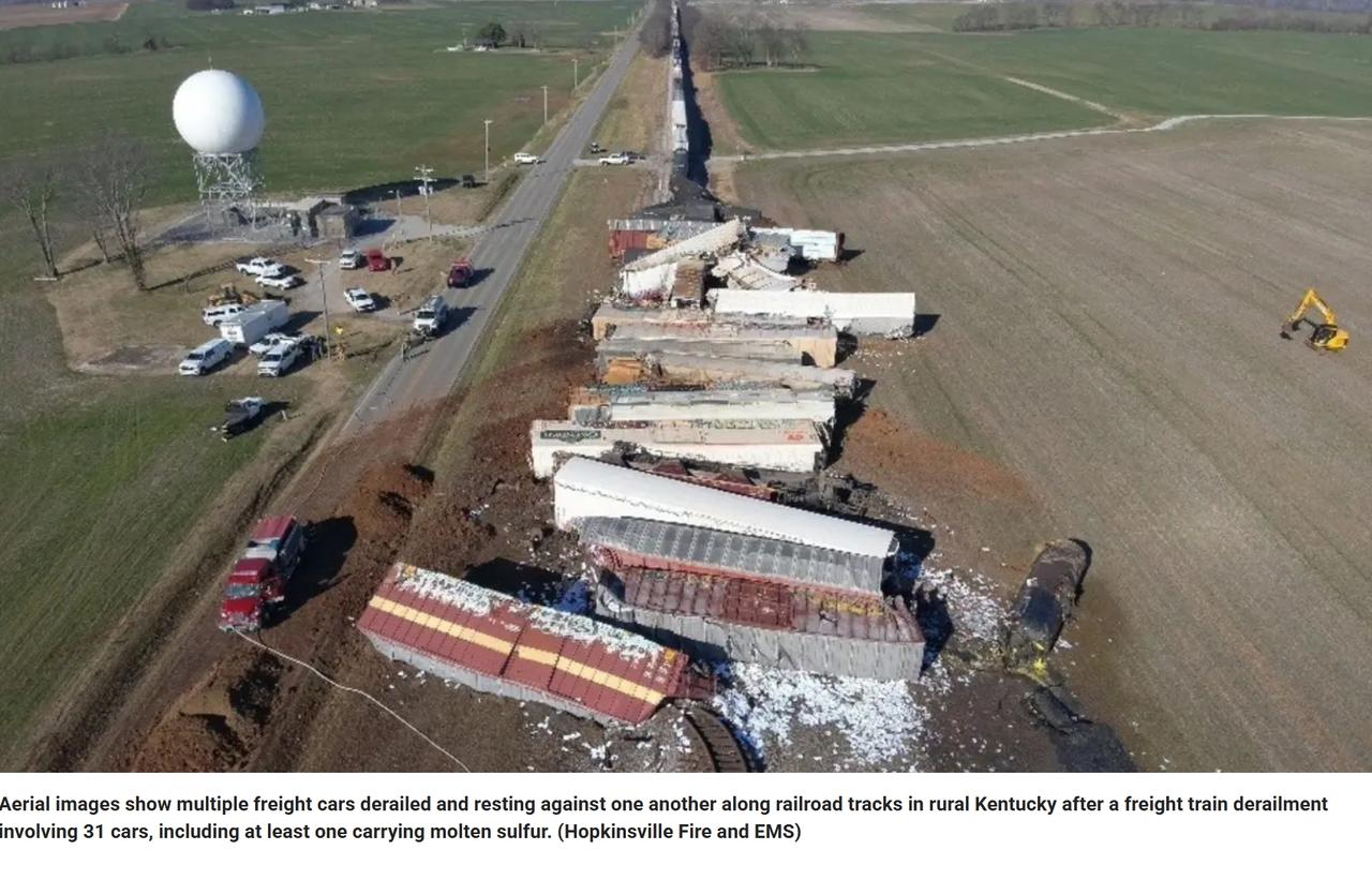 美国又有火车脱轨 当地时间周二,一列有30多节货运列车在肯塔基州脱轨,其中至少有一节车厢正在积极泄漏危险化学品。 脱轨事故发生在当地时间上午7点左右,地点位于托德县的一个农村地区。航拍显示,乡村的铁轨上,脱轨货车相互碰撞,几节车厢倾倒,碎片散落在附近的田野上。 其中一节车厢泄漏了熔融硫磺,硫磺被加热至液态,常用于工业应用,如化肥生产。据环境保护署称,熔融硫若受到干扰,可能导致严重的热烧伤并释放二氧化硫或硫化氢等刺激性气体。 目前尚未有人员受伤报告,脱轨原因目前正在调查中。