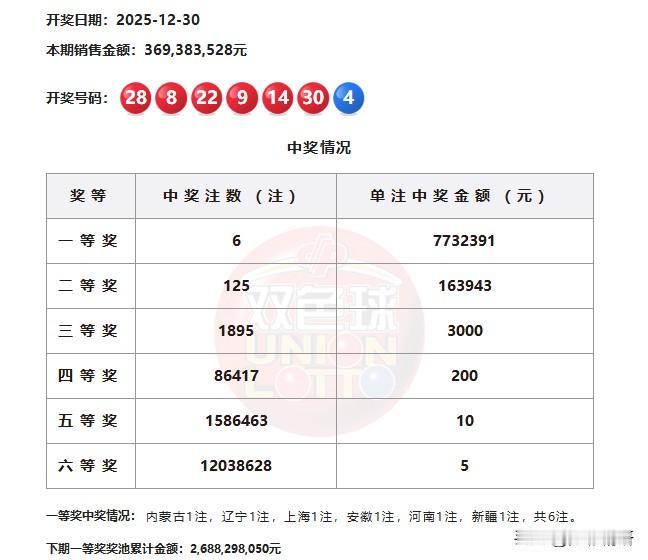 12月30日,双色球2025年的帷幕缓缓落下。回首这一年,若要用一句话来概括,便是——开局惊艳如王炸,收尾平淡似静水。 全年共诞生1528注一等奖。年初的第一期——25001期,便以惊世骇俗的姿态震撼彩市:单期爆出108注一等奖,其中广东一位幸运儿独揽101注一等奖及15注二等奖,奖金总额高达5.31亿元,堪称年度最大亮点。然而,与这辉煌的开端形成鲜明对比的是,25078期却出现了罕见的空奖,一等奖无人问津。 奖池的走势同样令人瞩目——从年初的17.92亿元一路攀升至年末的26.88亿元,全年净增8.96亿元,增幅达50%,其增长速度可谓惊人。 在地域分布上,广东省毫无悬念地成为最大赢家,毕竟其销量长期稳居全国榜首;浙江与江苏紧随其后,分别位列第二、第三。珠三角与长三角依旧是彩票市场的两大主力阵营,牢牢占据着业绩的高地。 值得一提的是,今年并未举行派奖活动,个中缘由耐人寻味。按理说,奖池持续高企,正是派奖的好时机,但是否受到前任负责人事件的影响,就不得而知了。 这一年,有人因中奖而笑逐颜开,也有人与大奖擦肩而过。但无论如何,彩票的魅力在于希望与坚持——今年的幸运属于别人,明年的惊喜或许就在你手中。2026年,让我们在顶峰相见。