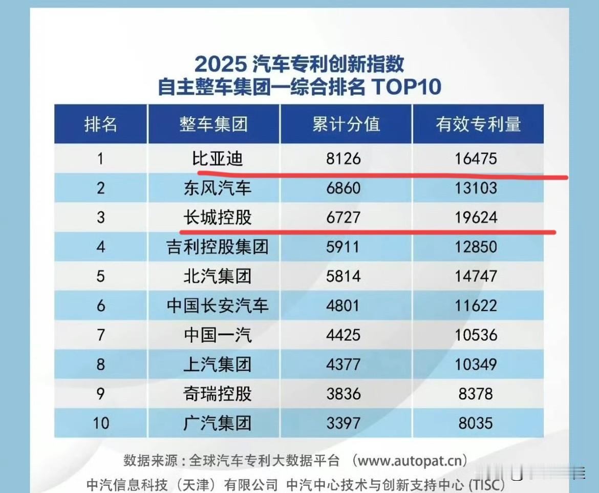 如果不是这份专利创新指数榜,我还以为比亚迪要“倒闭”了! 所以,大家也看到了吧?有时候专利数真的不是越多越好,而是要看厂商跟“含金量”的! 来自中汽统计2025年汽车专利数据自主整车品牌前10榜,比亚迪以16475个有效专利数,8126的累计分值排名第一! 在前10榜中,比亚迪专利不是最多的,但分值却是最高的,这就是“含金量”! 同样优秀的还有东风,在专利数只有13103个情况下,分值却高过了专利数19624的友商,排名第二![赞]