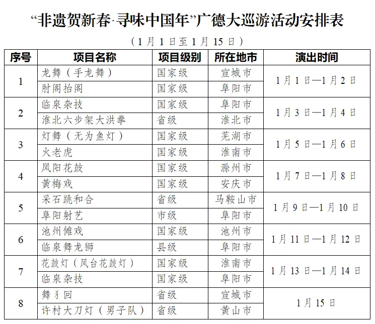 大皖新闻讯记者从广德市文化馆了解到,2026年1月1日-15日,安徽主场非遗巡演第一阶段落地广德,活动地点在广德市迎春街-绥安路。
