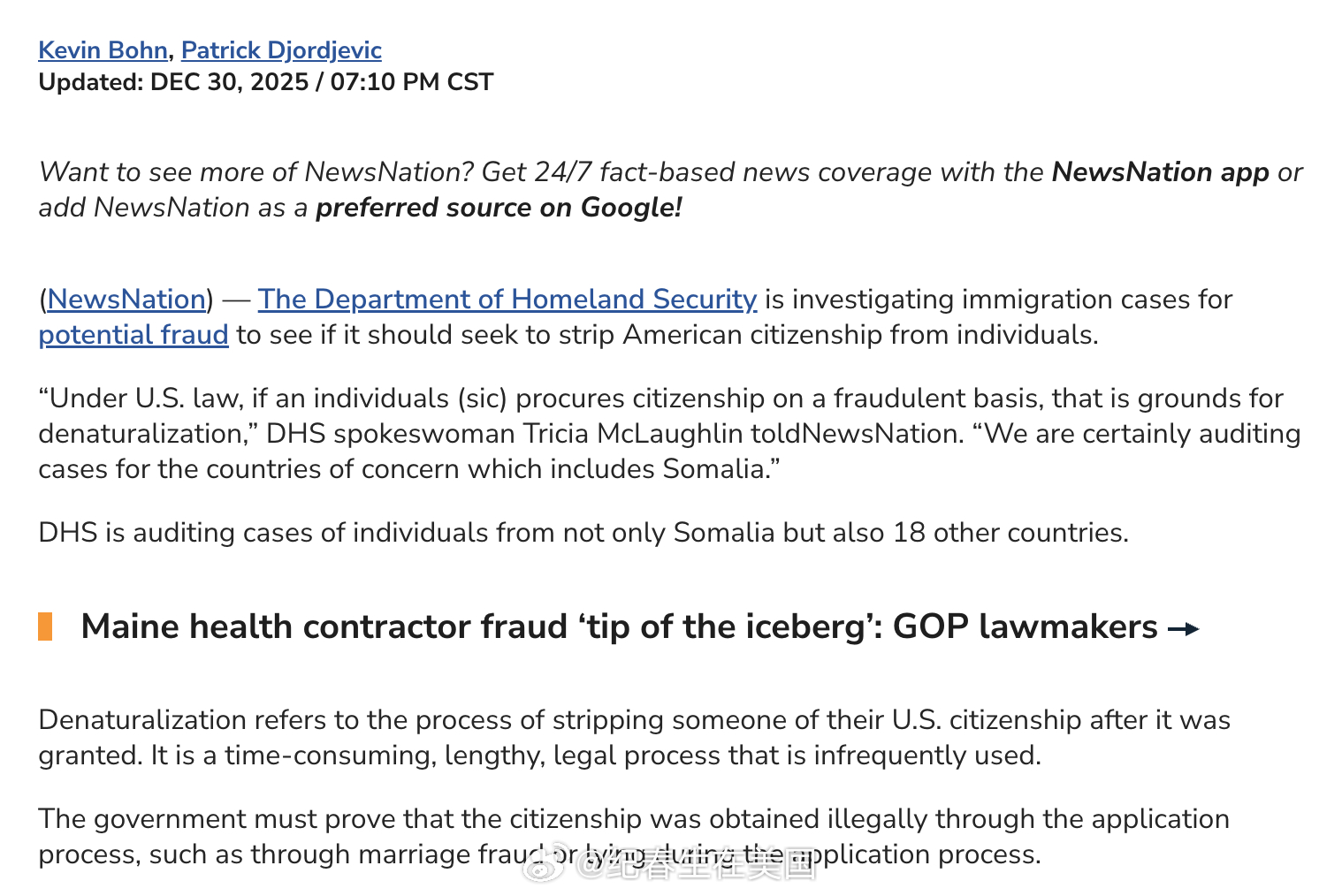 国土安全部正在积极审查索马里裔美国公民的移民案件,以查找可能导致剥夺国籍的欺诈行为。发言人Tricia McLaughlin表示:“根据美国法律,如果有人通过欺诈手段取得国籍,这就是剥夺国籍的理由。我们确实在审查相关国家的案例,其中包括索马里。”国土安全部不仅在审查索马里人的案件,还涉及其他18个国家的个人。今日焦点海外新鲜事热点现场