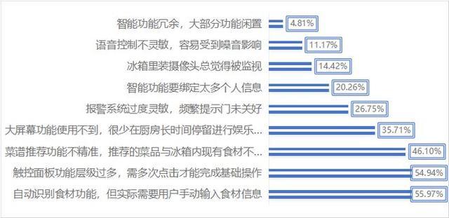 55.97%的受访者表示智能冰箱的自动识别食材功能失效,实际操作中往往需要手动输入信息;