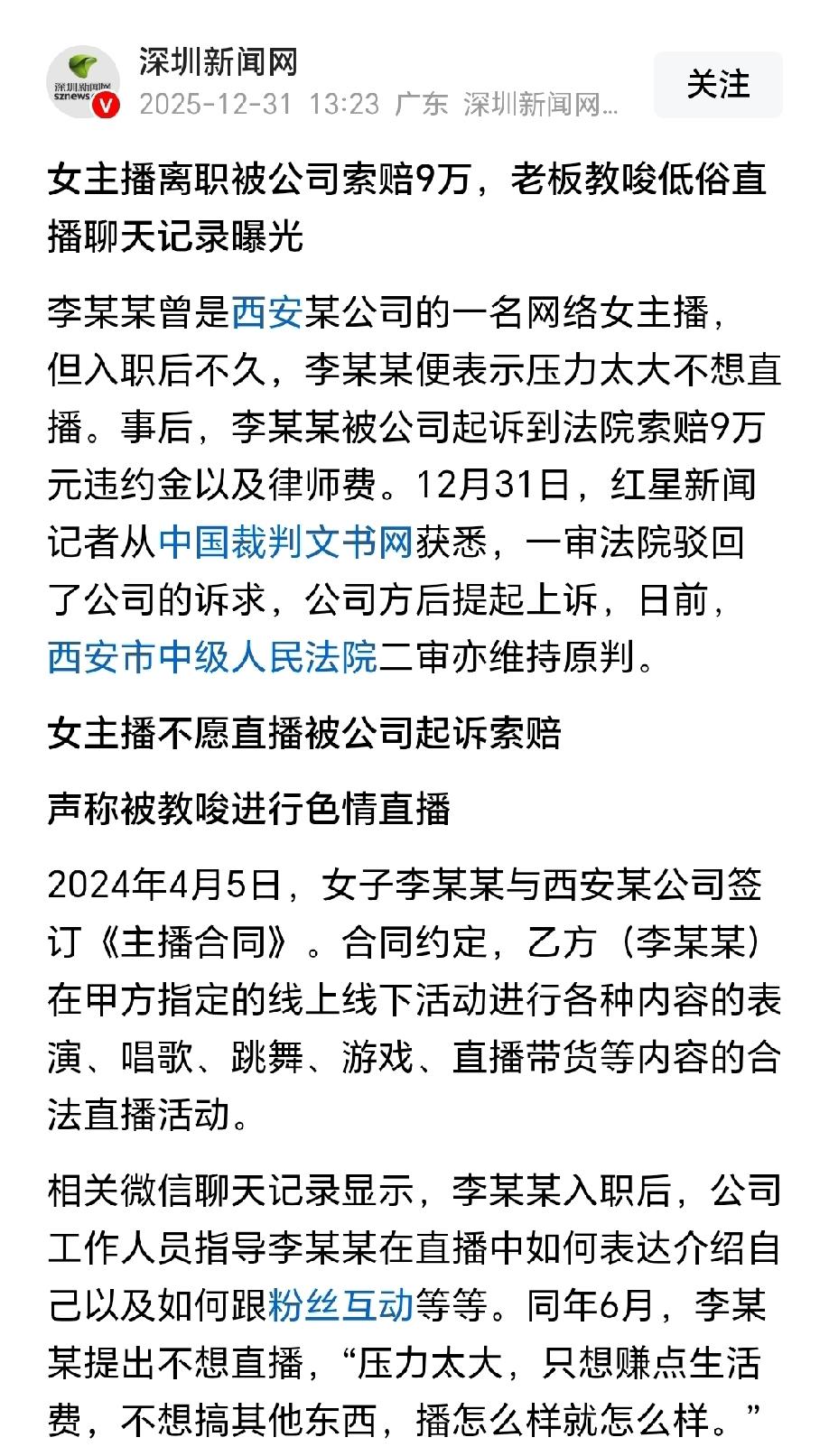 陕西西安,女子和直播公司签订合同,约定按照公司的要求,进行一些合法的直播活动,不成想,公司老板竟然教唆女子进行一些低俗的不良直播。女子只想赚点生活费,不想失去底线,因此提出解约。没想到,公司竟然把女子告上法庭,索要9万元违约赔偿。法院经过两审,判决大快人心! 2024年4月,李女士刷招聘软件时,一眼看中了一家公司的主播岗位。 招聘信息上写着双休、五险一金,听起来就是份正经工作,她琢磨着能靠这个赚点生活费,不用风吹日晒,挺好,没多想就和公司签了《主播合同》。 签合同时,李女士还仔细看了条款,需要按公司要求搞合法的直播活动,基本上就是一些唱歌跳舞带货活动,她当时还觉得自己找对了路子。 刚入职那会儿,一切都还算正常。公司工作人员手把手教她怎么介绍自己,怎么跟粉丝互动,李女士学得认真,想着好好干,多攒点钱。 可没过多久,她就觉得不对劲了。公司老板李某,也是她的直接运营,在工作群里说的话越来越离谱。 李某让她每天汇报和粉丝的聊天情况,还教她怎么“薅大票”。 更让李女士坐立难安的是,李某竟然教唆她对那些有家室、管得严的粉丝“拉扯”,甚至说可以寄丝袜之类的东西博眼球。 看到这些话的时候,李女士浑身都不舒服,她只想安安分分赚点生活费,哪能做这种突破底线的事?心里的抵触越来越强烈,压力也大得喘不过气。 到了6月,李女士实在扛不住了,跟公司摊牌,说自己不想再直播了。 可李某还在一个劲劝导,压根没提那些低俗建议的不妥,还声称这不是劳动雇佣关系,而是双方的合作关系。 李女士并不傻,她知道合同上写的是“合作协议”,但对比招聘时说的双休、五险一金,还有公司制定的惩罚制度,这分明就是劳动关系,哪是什么合作? 7月13日,李女士下定决心要解约。她告诉李某,自己要注销视频号和微信号,解除账号绑定,还直言要追回自己的工资。 本以为这事就算翻篇了,没想到没过多久,法院的传票就递到了手上。公司把她告了,张口就要9万元违约金,还要她承担6000元律师费。 收到传票的那一刻,李女士气笑了,她明明是因为对方教唆低俗内容才解约,怎么反倒成了被告? 于是,她很快冷静下来,把聊天记录、招聘信息、钉钉工作群的考勤记录都整理好,保留好这些证据。 对此,法院会如何审理呢? 法院查明,李女士直播的平台、场地、设备都是公司提供的,每天直播时间固定,内容和形式全由公司安排,还得接受钉钉群的严格考勤,报酬也和考勤挂钩。 她一个没什么粉丝的素人主播,根本没什么议价能力,和公司就是管理与被管理的劳动关系。 更重要的是,公司教唆低俗直播的行为,已经违背了公序良俗。 《民法典》第一百五十三条明确规定:违背公序良俗的民事法律行为无效。 本案中,公司与李女士虽表面约定“合法直播”,但李某通过工作群教唆李女士向粉丝“拉扯”、寄丝袜博眼球等低俗擦边行为。 因此,老板的本质是引导李女士违背性道德、损害网络公共秩序的行为,严重触碰公序良俗底线。 从法律逻辑来看,公司要求李女士履行的核心直播义务已违背公序良俗,对应的合同约定应属无效,其基于无效约定主张9万元违约金,自然无法得到法院支持。 《劳动合同法》第三条规定:订立劳动合同,应当遵循合法、公平、平等自愿、协商一致、诚实信用的原则。 依法订立的劳动合同具有约束力,用人单位与劳动者应当履行劳动合同约定的义务。 法院已查明双方虽名义上是“合作关系”,但李女士需遵守公司固定直播时间、考勤制度,接受公司对直播内容的全面管理,报酬与考勤直接挂钩,符合劳动关系特征。 作为用人单位,公司本应按照合法原则安排李女士的工作内容,却教唆其进行低俗直播,违反了劳动合同订立的合法原则。 李女士因公司要求违背自身底线而提出解约,属于被迫解除劳动合同,并非违约行为。 最终,法院直接驳回了公司的诉求。公司不服气,又提起上诉。 西安市中级人民法院二审,依旧维持了原判。 女主播表面看着光鲜亮丽,殊不知,背后却被老板压榨,还会面对一些不合理的要求,果然没有一份职业是轻松的。