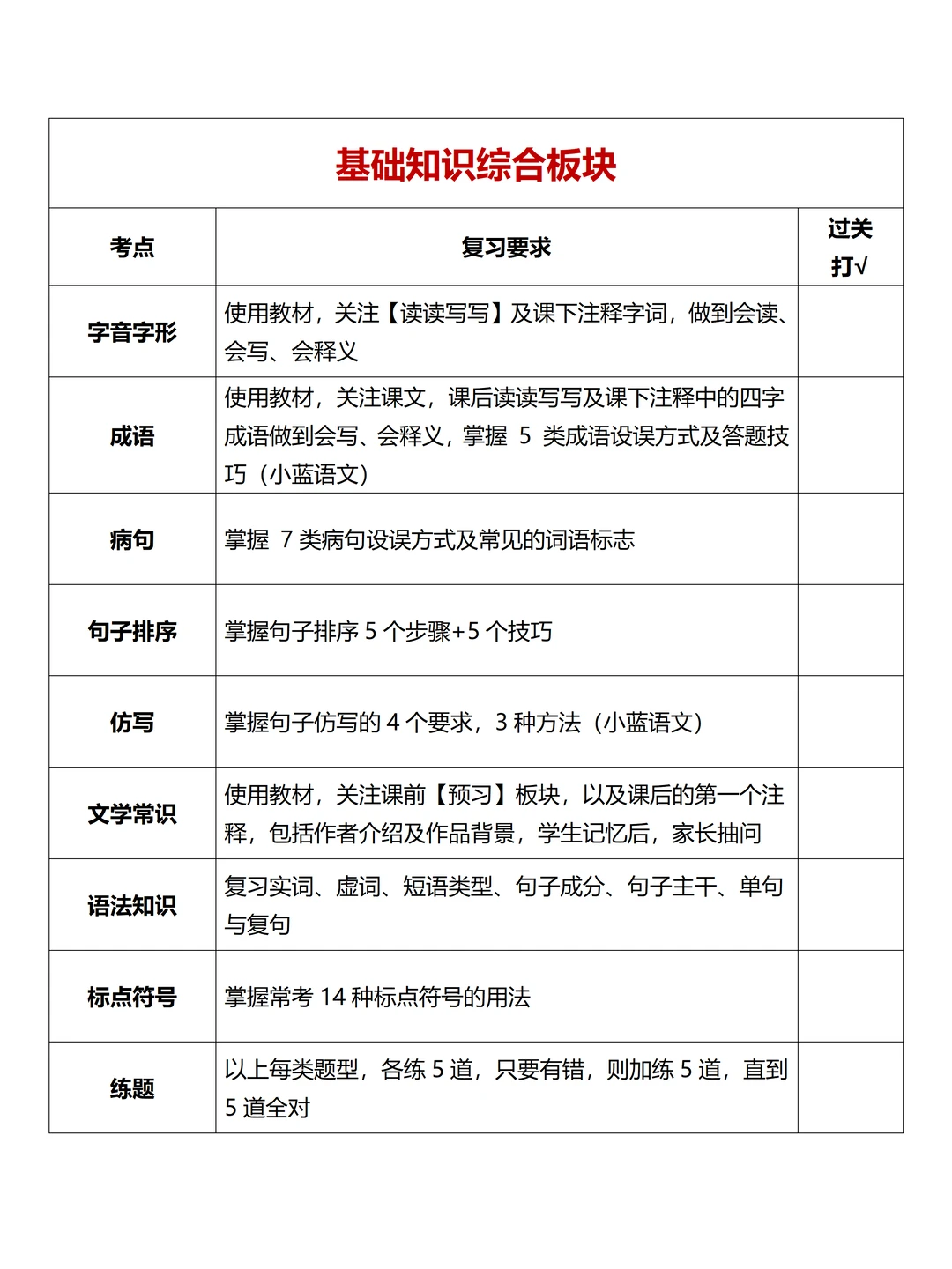 [三R]语文期末拼的不是刷题量,是基础不丢分 + 考点全覆盖,这份表帮娃把复习节奏稳住!