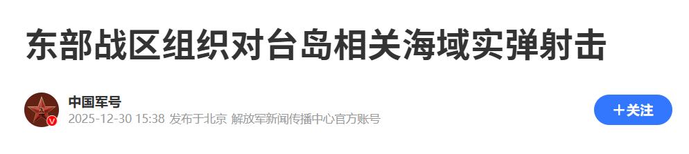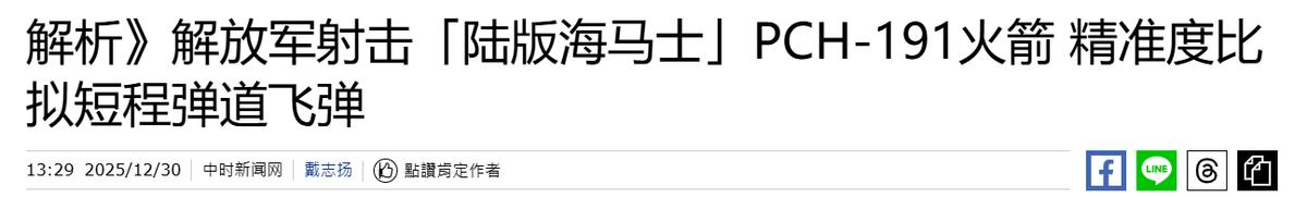 岛内某些人终于意识到!2025年12月30日,解放军远火射击后,台媒惊讶发现:191式火箭炮对台军威胁太大。 针对他们问题,我国立场非常明确,台湾是属于中国的领土,台湾问题是中国的那种问题。绝不允许任何外部势力台独分子勾结,破坏中国的统一。 但在我国三令五申的前提下,仍旧有外部势力同台独分子勾肩搭背,破坏着祖国的统一。就在最近这段时间,台湾问题极其突出。 针对这种情况,我国在近日举行了对台军演。此次的军事演习备受国际的高度关注,就在2025年12月30日的时候,我国解放军东部战区继续组织了多兵力,对台岛周边海空域展开了模拟打击。 据了解,在这次的模拟打击中,我国更是使用了191式火箭炮。在我国发射191式火箭炮后,台湾岛内展开了极大的舆论,台媒更是疯狂进行报道。 在我国的这次打击下,台湾媒体惊讶的发现来自大陆的191式火箭炮,对台军的威胁非常大。台湾媒体指出,在大陆北斗卫星的影响下,其打击精度已经与短道飞弹相当,但价格却不到1/10,将会是台湾“最大的威胁之一”。 直到这个时候,台湾媒体才意识到这一点,令人忍不住的感慨已经有点为时已晚。大陆同台湾的军事差距非常明显,但之前的台湾媒体却一直抱有幻想,认为大陆并不具备武力统一的能力。 但现实却狠狠的给他们上了一课,对此,您怎么看?欢迎评论区留言,您的看法,我们一起讨论一下。 (信息来源:解析》解放军射击「陆版海马士」PCH-191火箭 精准度比拟短程弹道飞弹-中时新闻网) (信息来源:东部战区组织对台岛相关海域实弹射击-中国军号)