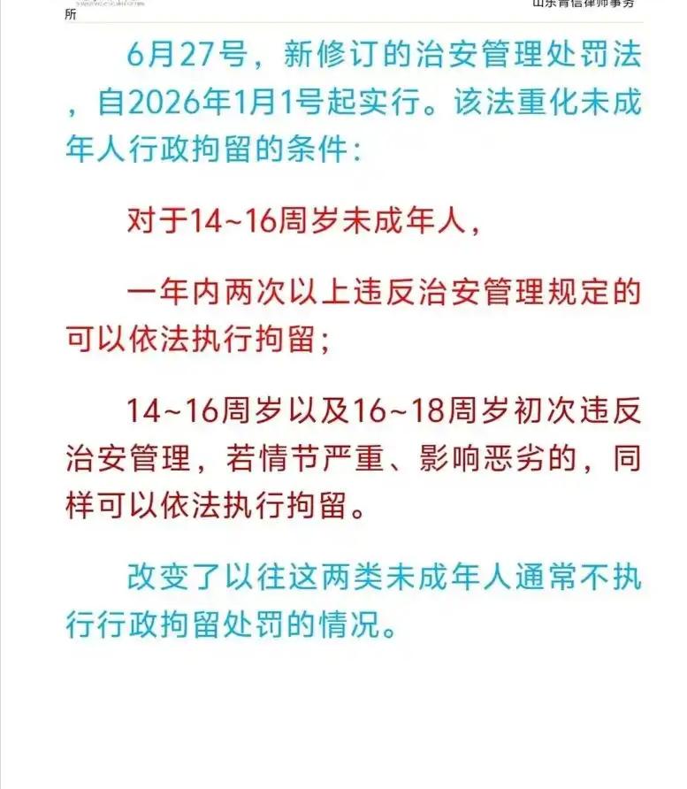 2026年1月1日,新修订的《治安管理处罚法》正式施行,“年龄免罪”成为历史。新规明确,14-16周岁未成年人、70周岁以上老人,若违法情节严重或一年内两次再犯,将不再豁免行政拘留;12周岁起实施特定恶性犯罪,经核准可追刑责。此次调整精准填补法律漏洞,宽严相济兼顾人文关怀,更彰显“违法必究”的法治精神,让公平正义不缺位。