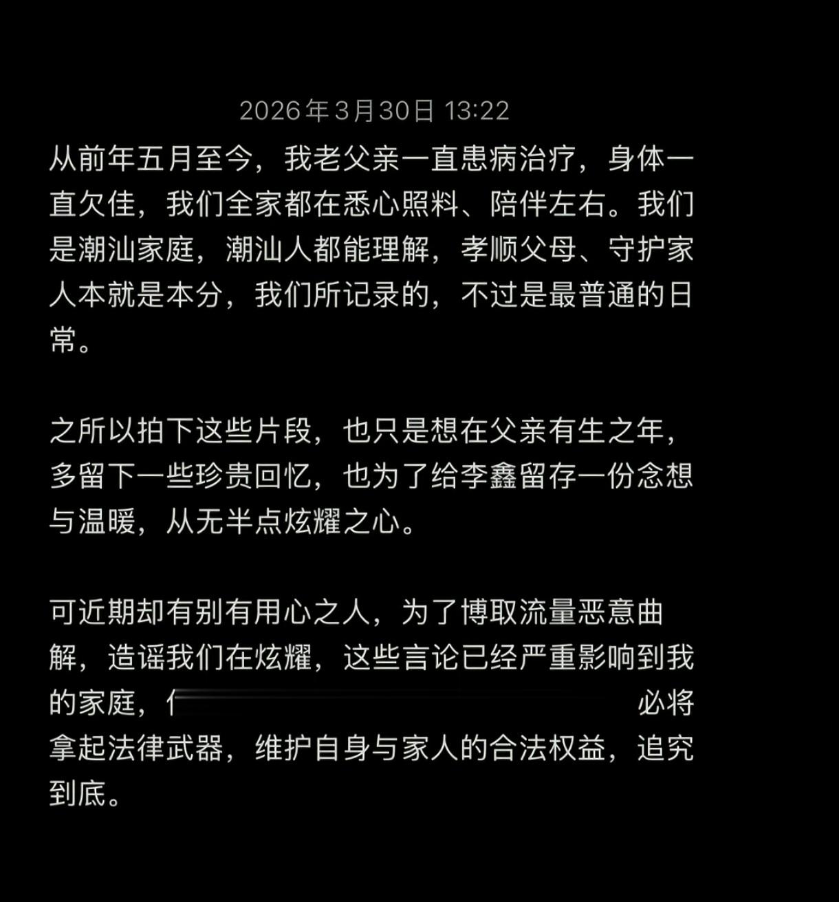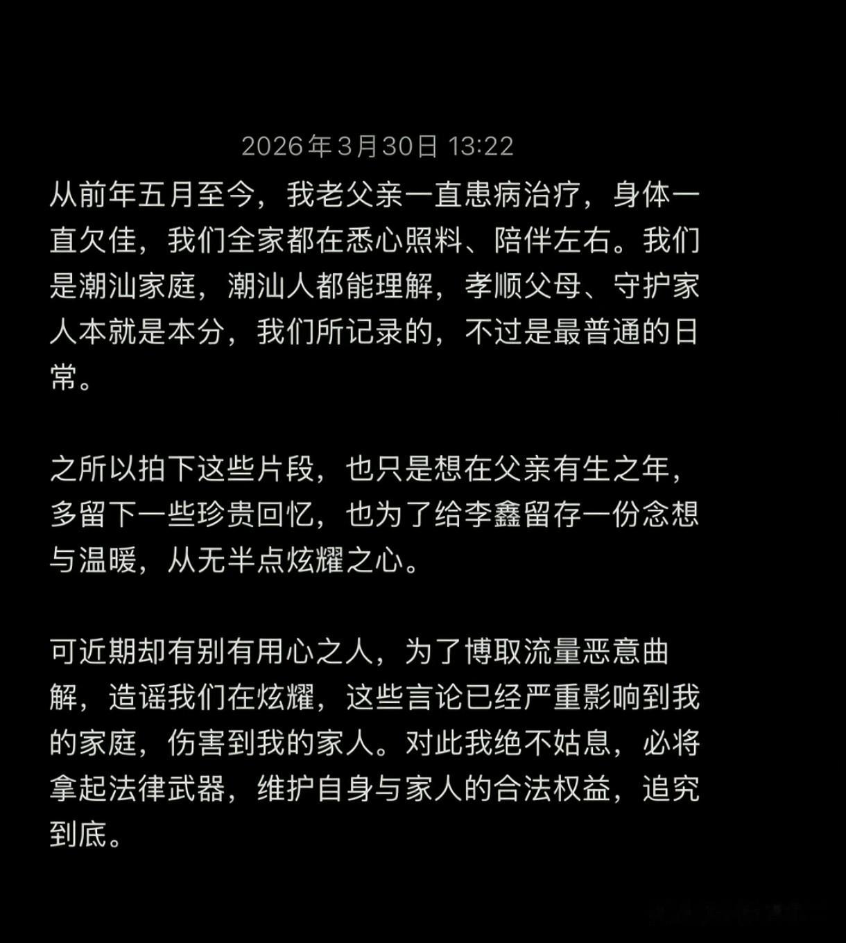 并且他还表示,很多言论伤害到了他的家庭和家人,他们将拿起法律武器维护自身与家人的权益。