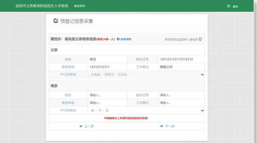 根据系统要求填写家长信息,要求至少填写一人。如下图: