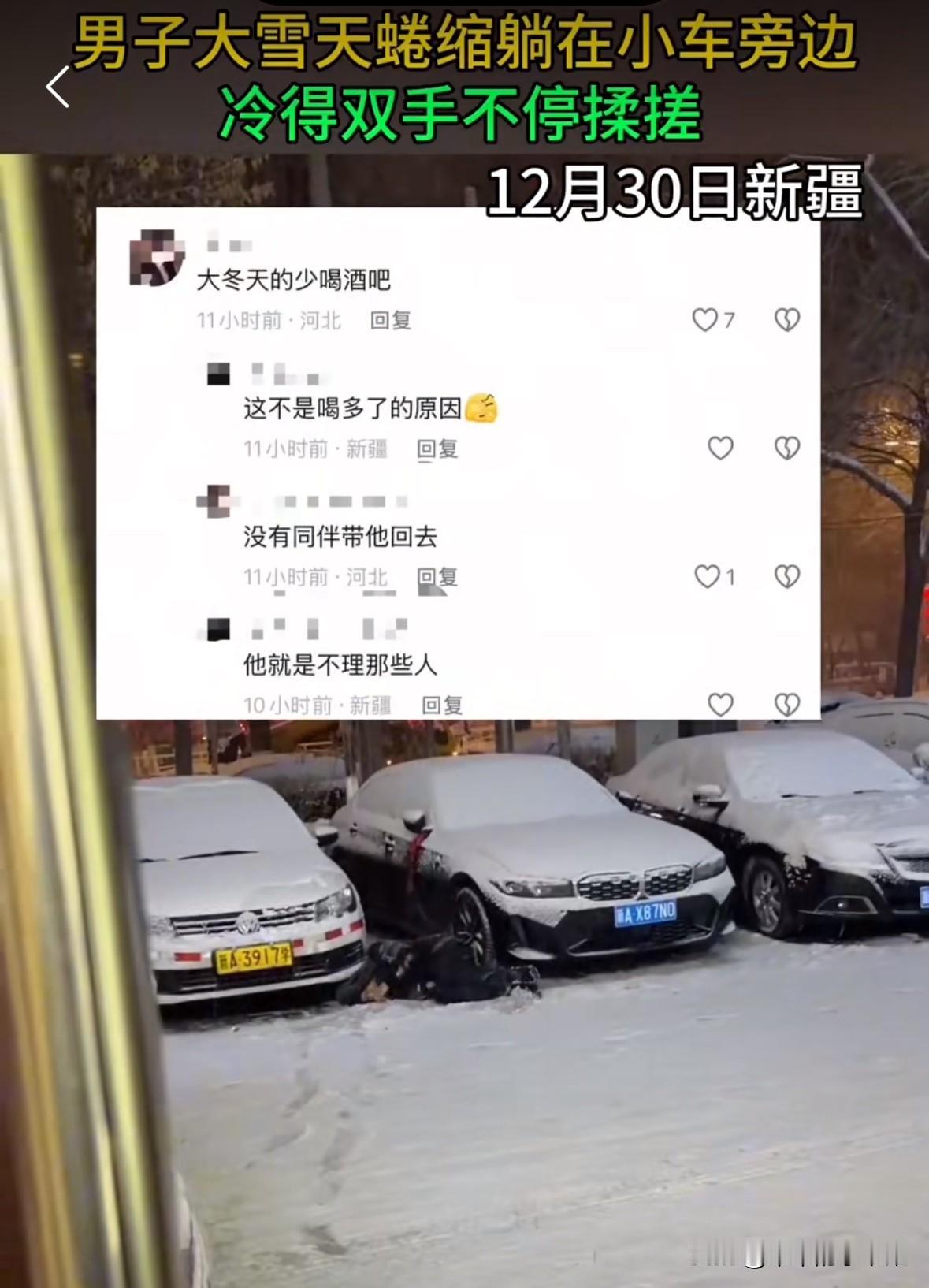 男子下雪天蜷缩在地上,冻的瑟瑟发抖,双手不停的揉搓。 这一看就是喝大了,他的狐朋狗友居然都不管他,这种朋友可以不要了。 他的妻子也不找他,估计经常喝,妻子对他失望了! 这样在外面冻半夜,很可能被冻死,如果有人发现了建议还是帮一把!下雪