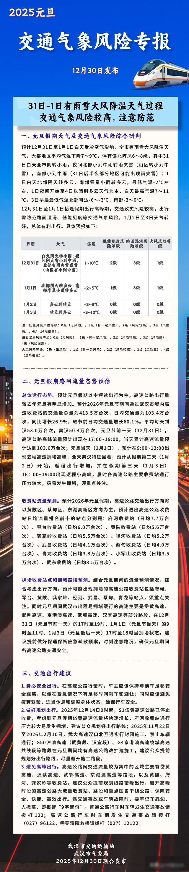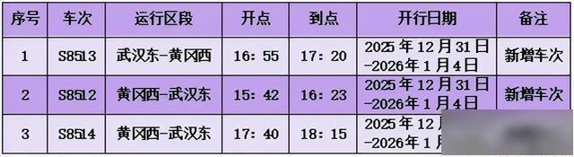 2025年12月31日-2026年1月4日期间,“新城快线”将按45列/日开行,新增假日临时列车3列/日,其中武汉东至黄冈西方向1列,黄冈西至武汉东方向2列。具体列车开行时刻表如下: