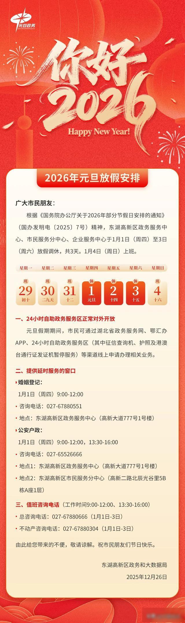 光谷书房·政务服务中心分馆1月1日至1月3日闭馆。