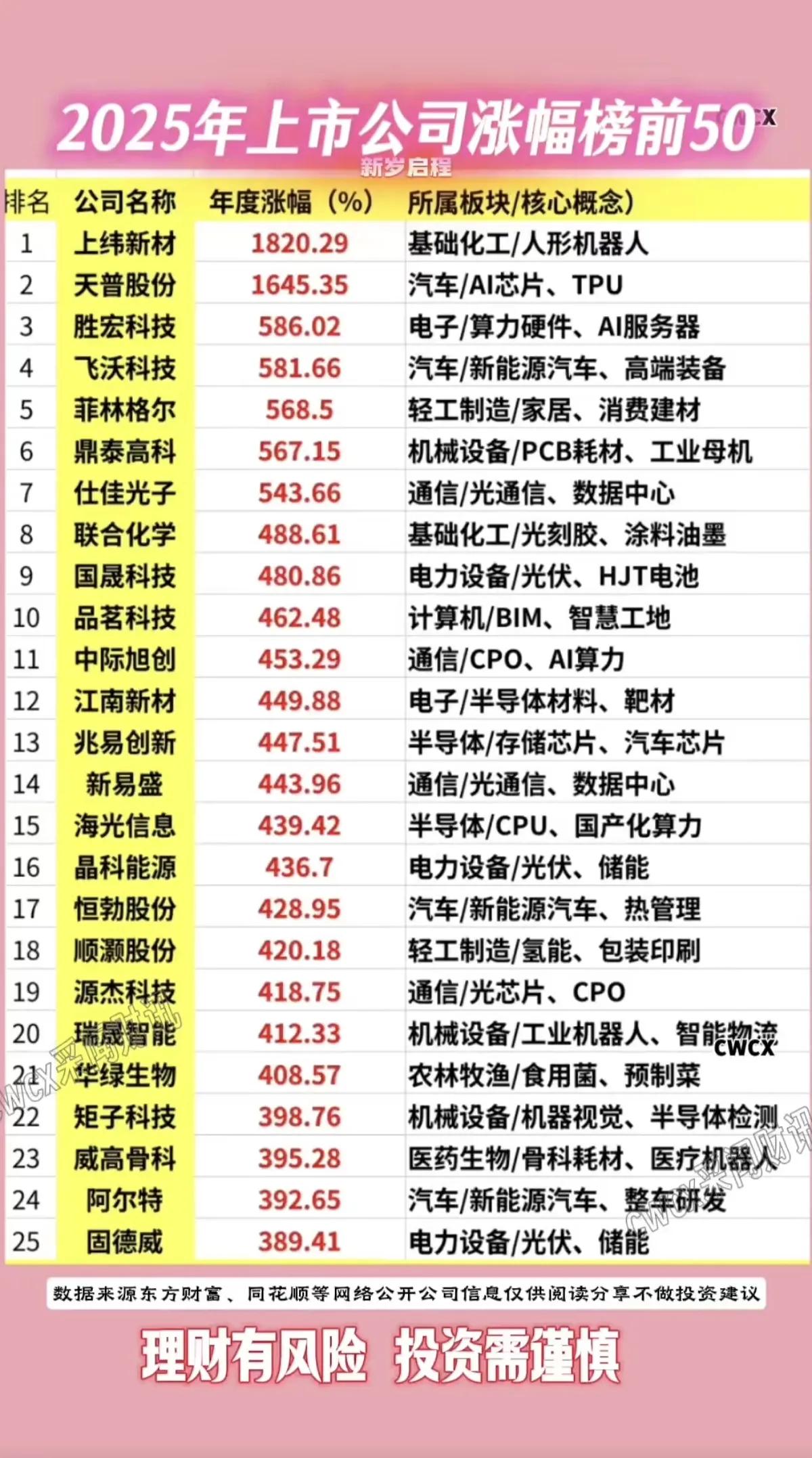 2025年,A股涨幅板排名前50!!! 上纬新材全年上涨1820.29%,位居涨幅板榜首,26年是继续冲高还是高位回调,值得期待;cpo板块胜宏科技、中际旭创、新易盛涨幅位居前列,26年,哪个板块能异军突起,让我们拭目以待吧!!!