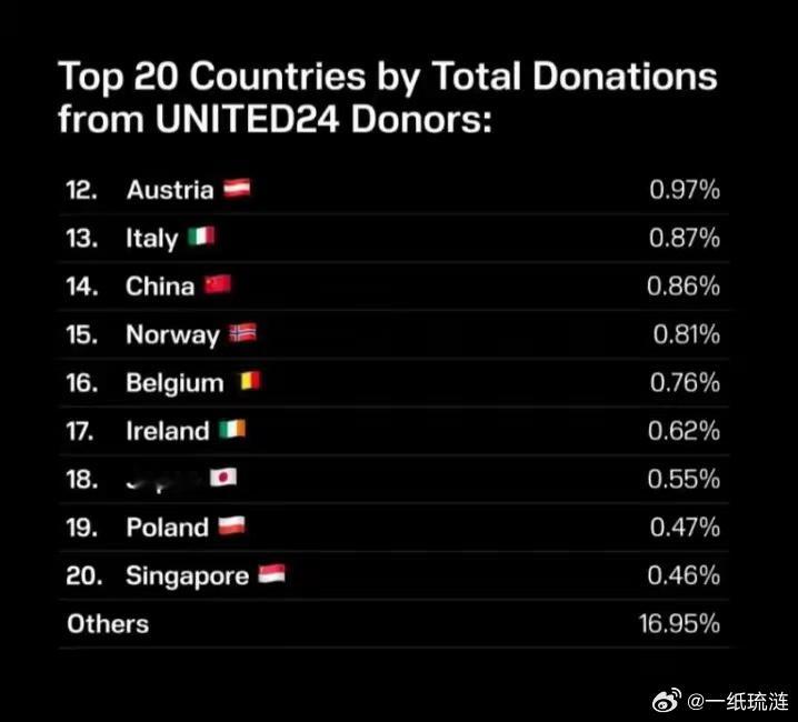 只能说咱们中国人还是太有钱了,略微出手就上了乌克兰的捐款榜单。最近,乌克兰政府运营的捐款平台公布了捐款数据。这个平台于2022年5月成立,筹集的资金主要分配到三个领域:国防和排雷、人道主义和医疗援助、乌克兰重建。目前该平台已经筹集了2916420568美元,其中2025年就筹集了1866194430 美元。而按照平台公布的榜单,中国捐款排到14位,占0.86%,大概2500多万美元。这个数据其实很不容易,因为很少有人知道这个平台,知道了不一定能打开网站,能打开网站不一定有国际支付卡。说实话,关注俄乌冲突三年多了,也是今天看到新闻才知道这个网站。刚才看了下,没有国际支付卡是付不了的。如果一切渠道通畅的话,中国肯定轻松拿榜一。