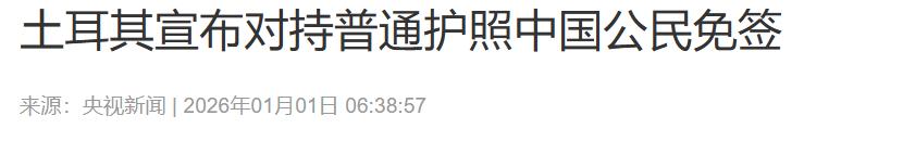 土耳其对华放大招!2025年12月31日,2025年最后一晚的深夜,土耳其重磅宣布,引起国际高度关注! 最近这段时间国际局势非常复杂,我国也毫不例外。因为台湾问题,我国同日本以及美国等一些国家的关系不断恶化。而这就让一些想要同我国交好的国家看到了机会,所以有部分国家借这个特殊时期,不断的对我国“放大招”。 就在2025年最后一个晚上的深夜,也就是2025年12月31日晚,土耳其官方重磅宣布对持普通护照公民免签。 据土耳其发布的总统令显示,自2026年1月2日起,对持中国普通护照的公民实行免签入境政策。 在每180天内免签停留时间累计不超过90天,适用于旅游和过境目的。土耳其的这项举动引起国际高度关注,在2026年来临之际,土耳其给我国送来了一份大礼。 截止到目前,已有多个国家对我国普通护照实行免签政策,例如阿联酋,亚美尼亚,波黑等,这些国家同土耳其一样是180天内免签90天。而除了这一免签方式之外,还有多种免签方法。 随着越来越多的国家同我国免签,就足以证明,我国在国际的影响力稳步提升。当然国家免签并不单纯因为我国影响力,免签是一个互利共赢的方式。 中国游客具有一定的消费能力,能够很好的带动当地的经济发展。所以针对中国实行免签政策,能够更好的带动当地的旅游业发展等,所以这也是主要原因之一。 对此,您还知道哪些原因?欢迎评论区留言,我们一起讨论一下。 (信息来源:土耳其宣布对持普通护照中国公民免签-央视新闻)