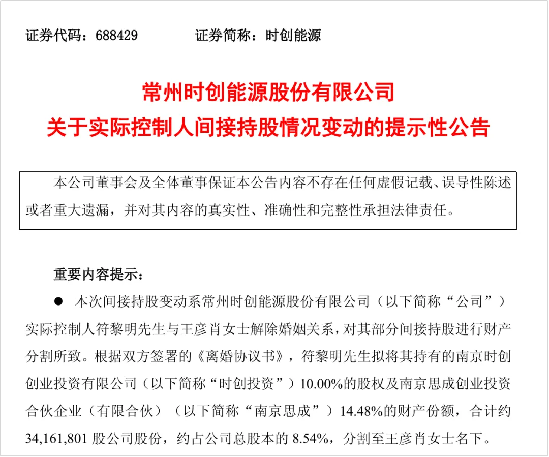 华夏能源网获悉,12月30日晚间,时创能源(SH:688429)公告称,公司实控人符黎明先生(董事长、法人代表)与王彦肖女士解除婚姻关系。财产分割后,王彦肖将间接持有时创能源约3416.18万股股份,约占时创能源总股本的8.54%。