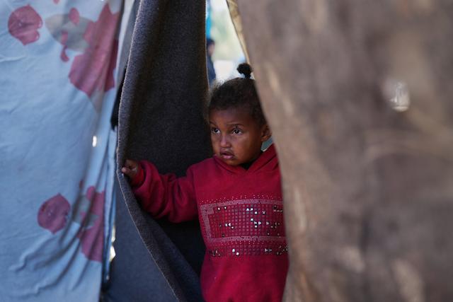 2025年12月27日,在加沙地带代尔拜拉赫,一名女童在临时帐篷内向外张望。新华社发