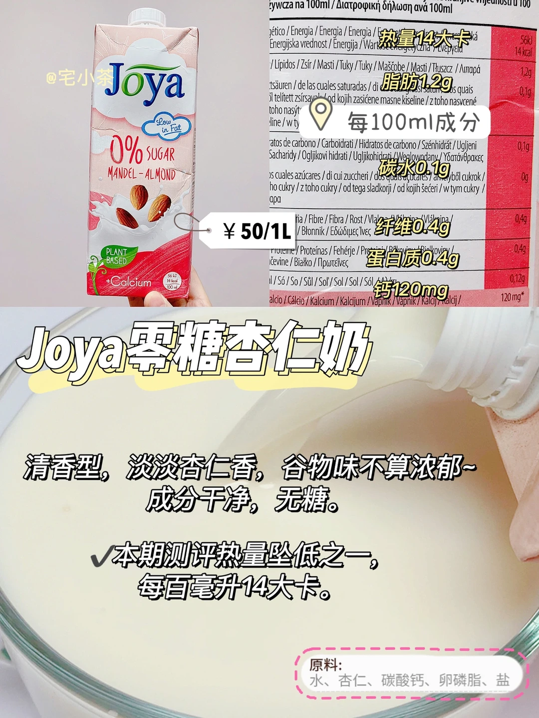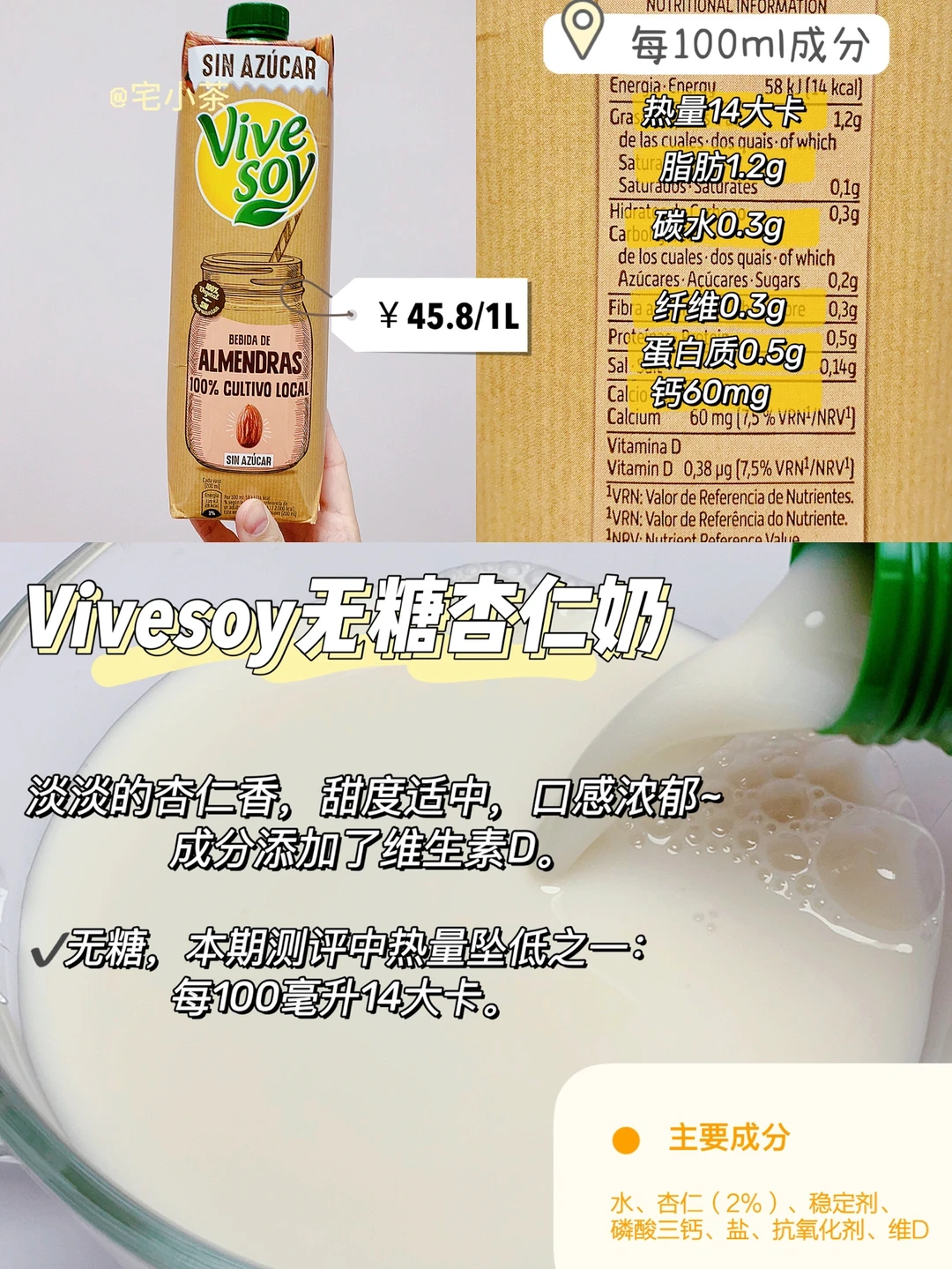 Joya零糖杏仁奶、vivesoy无糖杏仁奶本期热量坠低,均为14大卡/100毫升。