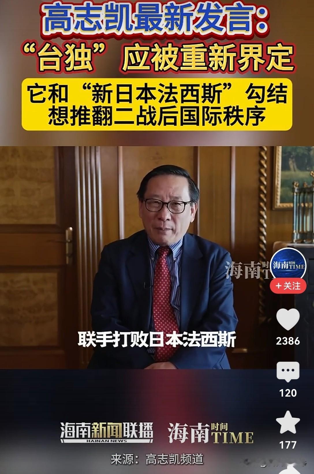 越看高教授就越感觉他厉害,这个人的厉害,是因为他的脑回路非常的清奇。 当别人还在循规蹈矩的在正面战场上搏杀的时候,他早就兵出奇招迂回过去了。 咱们怎么没有想到呢?台独分子的定义应该重新界定一下啊。 他们不仅仅是企图分裂祖国的一小撮异见分子。 他们更是跟日本军国主义分子勾结,妄图推翻二战胜利秩序的一伙军国主义分子余孽。 他们是什么呀?他们是战犯啊。 他们现在所做的所有行为,就是战犯在做的行为,就是军国主义复辟。 你从这个角度去打击他们,力量是不是更强大了呢? 高志凯教授真的是太厉害了。 您说人家这脑子怎么长的呢?怎么就这么聪明呢? 有的时候,人真的要承认智商这方面确实是有差距的,而且是巨大的差距。