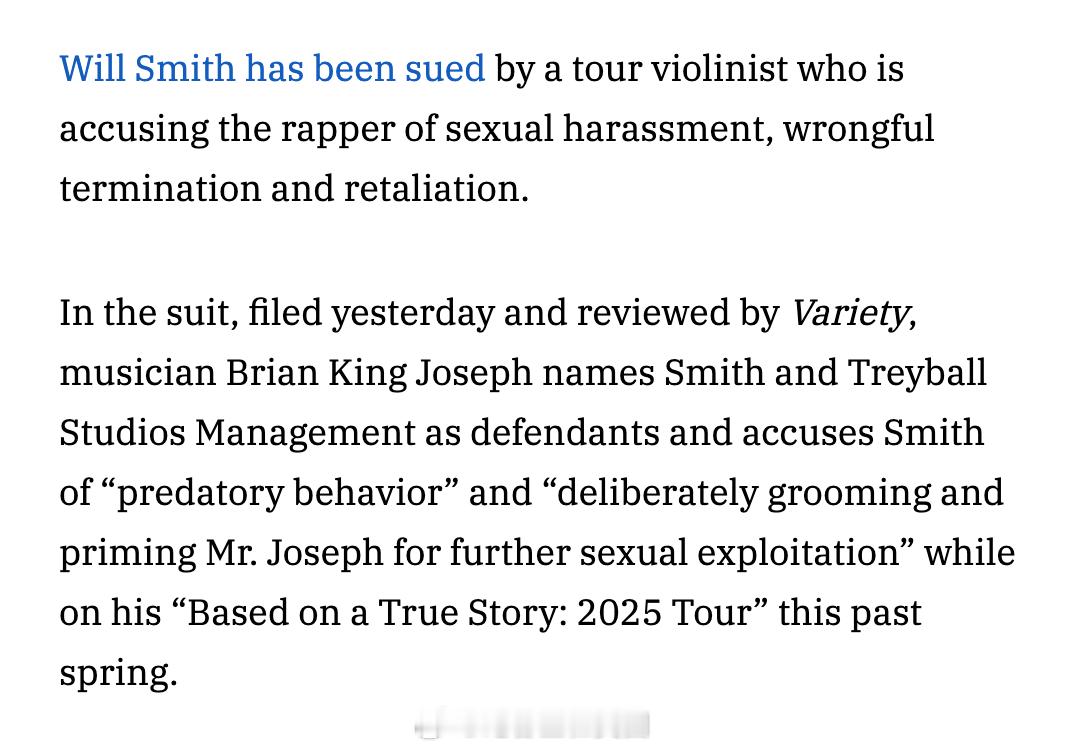 Will Smith被巡演小提琴手起诉,指控其性骚扰及不当解雇和报复行为。音乐人Brian King Joseph将 Will Smith及其Treyball Studios Management公司列为被告。他指控Will Smith在去年春天的“Based on a True Story: 2025 Tour”巡回演唱会期间,存在“掠夺性行为”,并“蓄意对Brian King Joseph进行诱导以便进一步进行性剥削”。诉状称,Will Smith于2024年11月聘请Brian King Joseph在圣地亚哥的一场演出中表演,随后邀请他加入2025年的巡演,并参与其新专辑的录制。随着两人关系的加深,Will Smith曾对Brian King Joseph表示:“你和我之间有一种特殊的联系,这是我与其他任何人都没有的”,以及其他类似的表达。诉状中提到的关键细节包括:Brian King Joseph称其装有酒店房卡的包失踪了几个小时,随后管理层找到并归还给了他。他指出,只有管理层人员有权进入他的房间。当晚晚些时候,Brian King Joseph回到房间发现有人非法进入,并留下了湿巾、一瓶写有他人名字的HIV药物,以及一张纸条,上面写着:“Brian,我最晚5:30回来,就我们两个(画着爱心),Stone F。” Brian King Joseph将此解读为一种警告,即“一名身份不明的人很快将回到他的房间与其发生性关系”。Brian King Joseph随后通知了酒店安保人员和Will Smith的代表,并向警方非紧急热线报了案。他声称,仅仅几天后,管理团队的一名成员就因此事对他进行羞辱,并告知他被解雇了,甚至暗示整件事都是Brian King Joseph编造的。海外新鲜事今日焦点