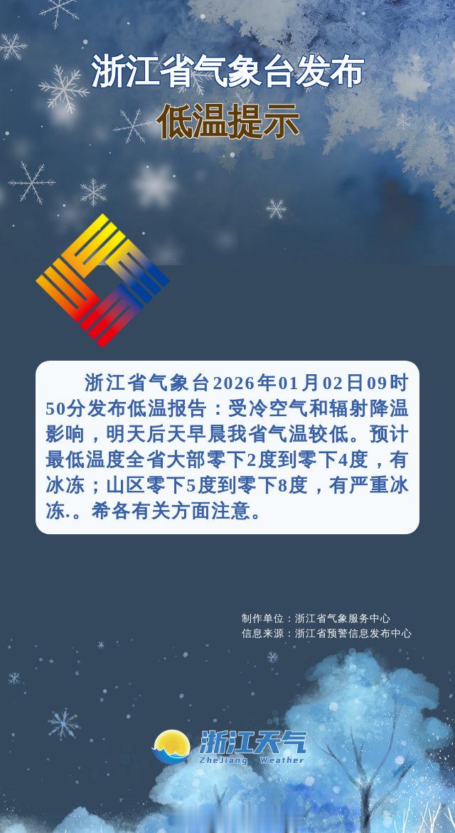据浙江省气象台消息,今天,晴好天气回归,白天气温略有回升。但3日4日早晨气温非常低,全省大部气温低至-2--4℃,有冰冻;山区更冷,能到-5--8℃,会出现严重冰冻。