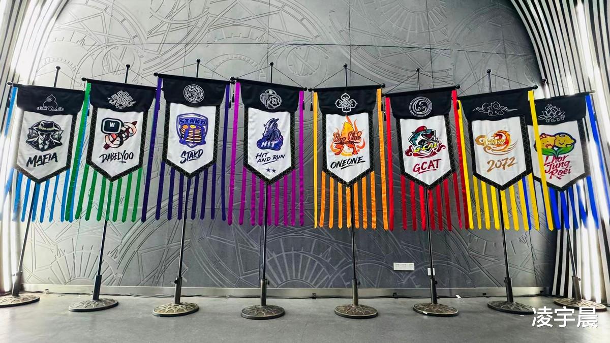 还有8支队伍的战旗也非常有特色,要知道这些战旗可不是简单工艺,而是由苏绣传承人张雪老师用极高水准的苏绣手法制作而成!每幅战旗画面都极具特色,或如火焰一般炽热、或如铠甲一般坚韧。所有战旗均采用黑底白主体+三角旗型的基础框架,白底的主体旗面有战队专属徽章,既保证赛事场景的整齐感,又能快速区分战队,可以说设计得非常巧妙了。