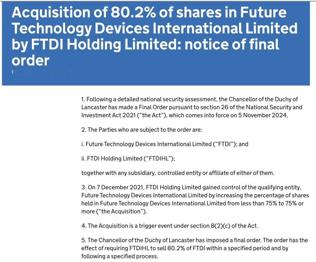 英国再出手!继荷兰抢夺中资控股安世半导体后,伦敦又以“国家安全”为由,迫使中国建广交出FTDI公司80.2%的股份。 这意味着中国建广资产辛辛苦苦收购并运营了三年的FTDI公司80.2%的股份,必须被吐出来。这就好比两个人正常做买卖,钱货两清之后,卖方突然反悔,找了个莫名其妙的借口要把东西要回去,完全不讲商业规则和诚信。 FTDI这家公司,它位于苏格兰格拉斯哥,在USB桥接芯片这个细分领域那可是有着“隐形冠军”的美誉。可别小瞧了这个细分领域,USB桥接芯片在各种电子设备里那可是起着关键作用。 但FTDI之前的日子过得并不舒坦。在2021年中国建广资产收购它之前,这家公司就像一颗被埋在土里的金子,虽然有价值,但却没人发现。 那时候英国政府对它根本不闻不问,所谓的“国家安全”审查机构也像消失了一样,完全没把这家企业的死活放在眼里。 再看中国建广资产的收购行为。2021年12月,中国建广资产看到了FTDI公司在医疗设备、工业控制台甚至高端电子产品中的核心价值。 在医疗设备里,USB桥接芯片能让各种检测设备、治疗设备之间实现数据的高速传输和稳定连接,提高医疗诊断和治疗的效率; 在工业控制台中,它能确保控制信号准确无误地传输到各个执行部件,保障工业生产的顺利进行;在高端电子产品里,更是能让不同功能的模块协同工作,提升产品的性能和用户体验。 中国建广资产果断出资拿下了FTDI公司80.2%的绝对控股权,这是一次基于商业眼光和战略布局的正常收购行为。 而且这笔交易是在英国新版《国家安全与投资法》全面生效之前就已经完成交割的。按照正常的商业逻辑和法律常识,法不溯及既往。买卖既成,落袋为安,这是天经地义的事情。 可英国这帮精英们的玩法,完全刷新了人们对无耻的认知下限。他们不顾商业规则和法律原则,强行要求中国建广交出股份。这背后到底藏着什么猫腻呢? 其实,这背后反映的是英国一些势力对中国企业崛起的恐惧和嫉妒。近年来,中国企业在半导体等高科技领域取得了长足的进步,不断突破技术瓶颈,提升自身竞争力。 这让一些习惯了在国际市场上占据主导地位的西方国家感到不安,他们害怕中国企业的崛起会威胁到他们的利益和地位。于是,他们就找各种借口来打压中国企业,这种以“国家安全”为由的审查和干预,就是他们常用的手段之一。 类似的事情在半导体领域可不止这一件。就拿美国来说,它为了打压中国的华为等科技企业,不仅禁止本国企业向华为出售芯片等关键零部件,还联合其他国家一起对华为进行封锁和打压。 美国还以“国家安全”为由,阻止中国的企业收购美国的一些半导体公司。比如2016年,中国福建宏芯基金收购德国半导体企业爱思强,本来这笔交易已经得到了德国政府的批准,但美国却横插一脚,以“国家安全”为由要求德国重新审查这笔交易,最终导致交易失败。 还有2018年,美国总统特朗普签署行政命令,禁止美国公司向中兴通讯销售零部件、商品、软件和技术,时长达7年,这让中兴通讯一度陷入困境。 这些案例都充分说明,一些西方国家为了维护自身的利益和霸权地位,不惜违背商业规则和国际准则,对中国企业进行无理打压。 回到英国这次对FTDI公司的收购干预事件,这不仅仅是对中国建广资产的一次商业打击,更是对国际商业秩序和公平竞争环境的一次严重破坏。 如果这种行为得不到制止和纠正,那么以后国际间的商业收购和投资都将面临巨大的风险和不确定性。 其他国家的企业在进行跨国收购时,也会担心会不会像中国建广资产一样,在交易完成后被以各种莫名其妙的理由要求交出股份。这将严重阻碍全球经济的发展和国际间的合作与交流。 英国政府应该认清形势,停止这种无理的干预行为。商业活动应该遵循市场规律和法律原则,而不是被政治因素所左右。 中国企业在国际市场上的发展是靠自身的努力和实力赢得的,不是靠不正当手段获取的。英国应该以开放和包容的心态对待中国企业的投资和收购,共同推动全球半导体产业的发展和进步。 否则,英国这种短视和自私的行为,最终只会损害自身的利益和国际形象,让自己在国际舞台上陷入孤立无援的境地。